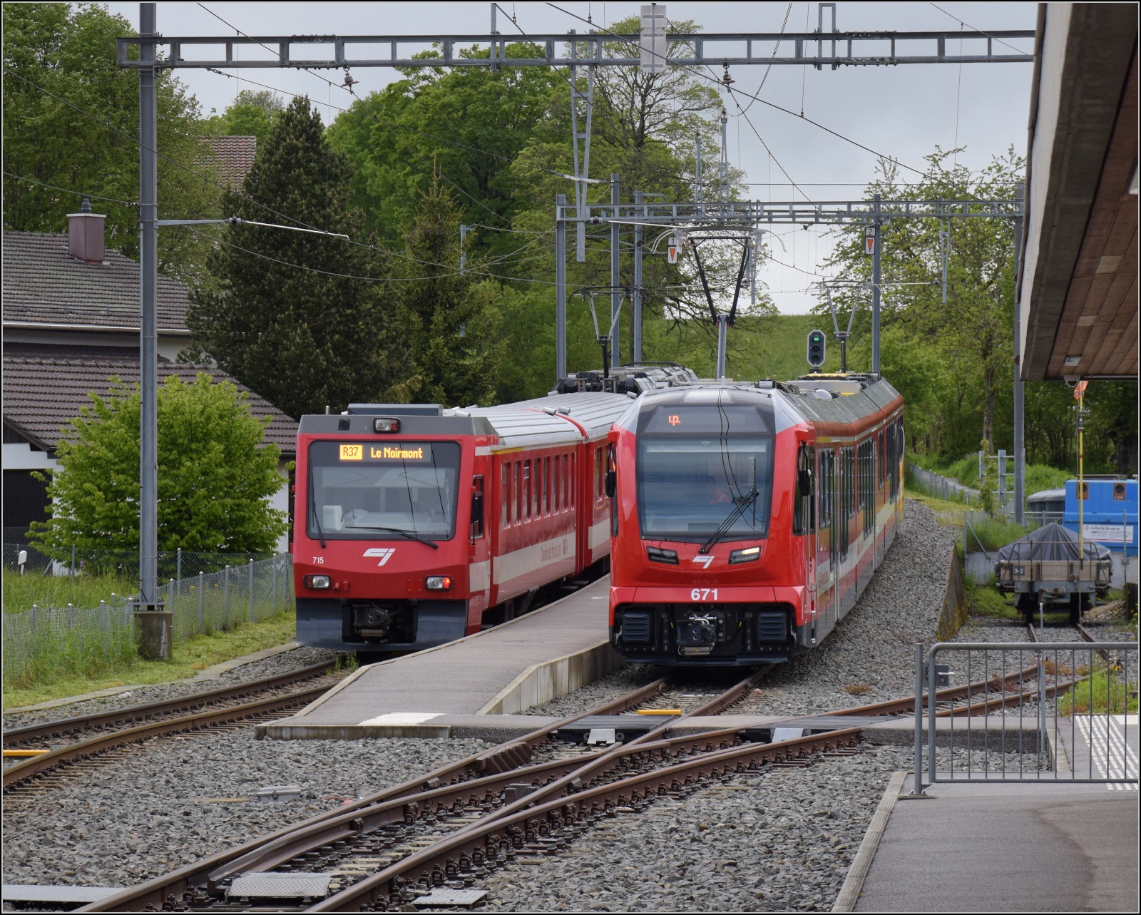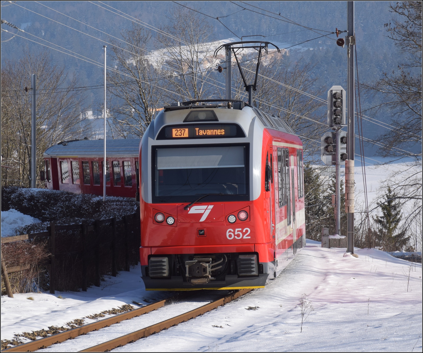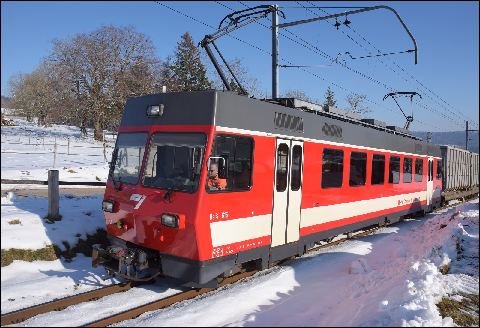 Erst daheim habe ich entdeckt, das Bild zeigt den neuen dreiteiligen Zug der CJ. Er dürfte sich wohl ABe 4/12 671 nennen. Eine äusserliche Ähnlichkeit mit dem Capricorn der RhB ist nicht zu übersehen. Les Reusilles, Mai 2024.