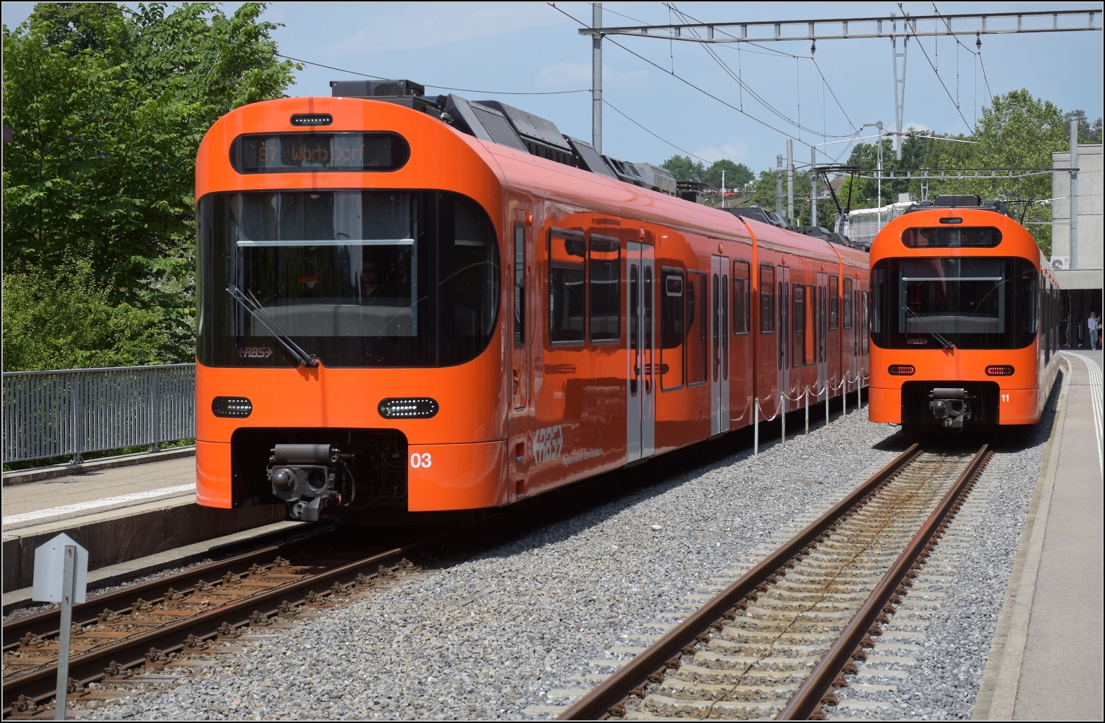 Das Blaue Bähnli VBW BDe 4/4 36 auf der falschen Strecke nach Worb. Hier vor dem Metrohaus in Worblaufen. Juni 2023.
