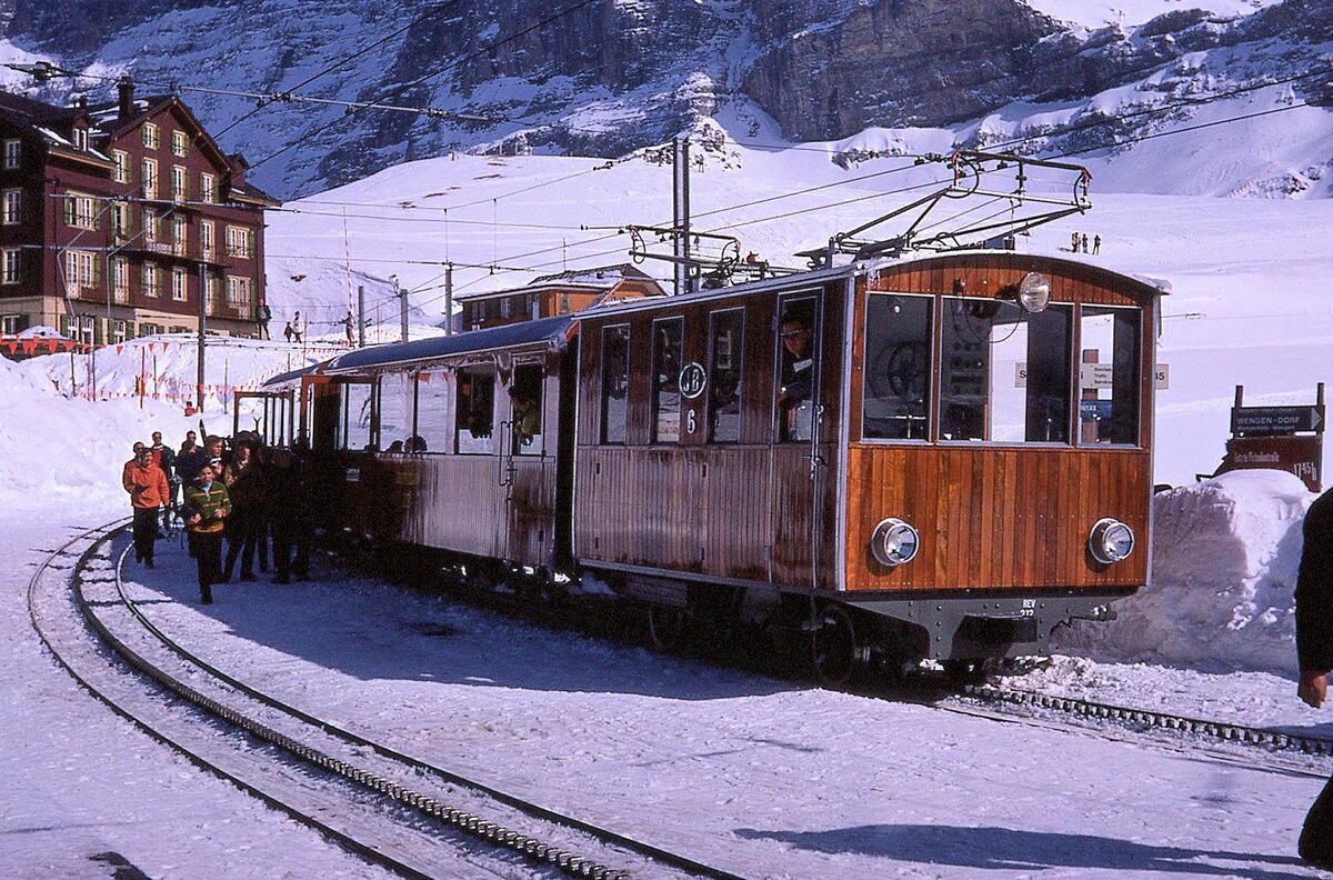 Jungfraubahn, Rowan-Komposition mit Lok 6: Die Lok mit einem Schild  007-Spezial  auf der Kleinen Scheidegg, 30.März 1970