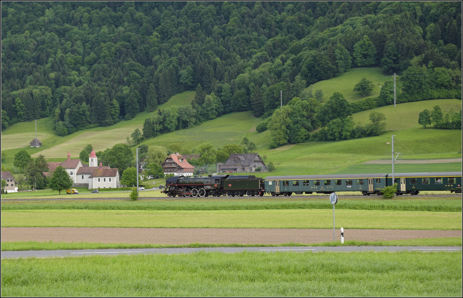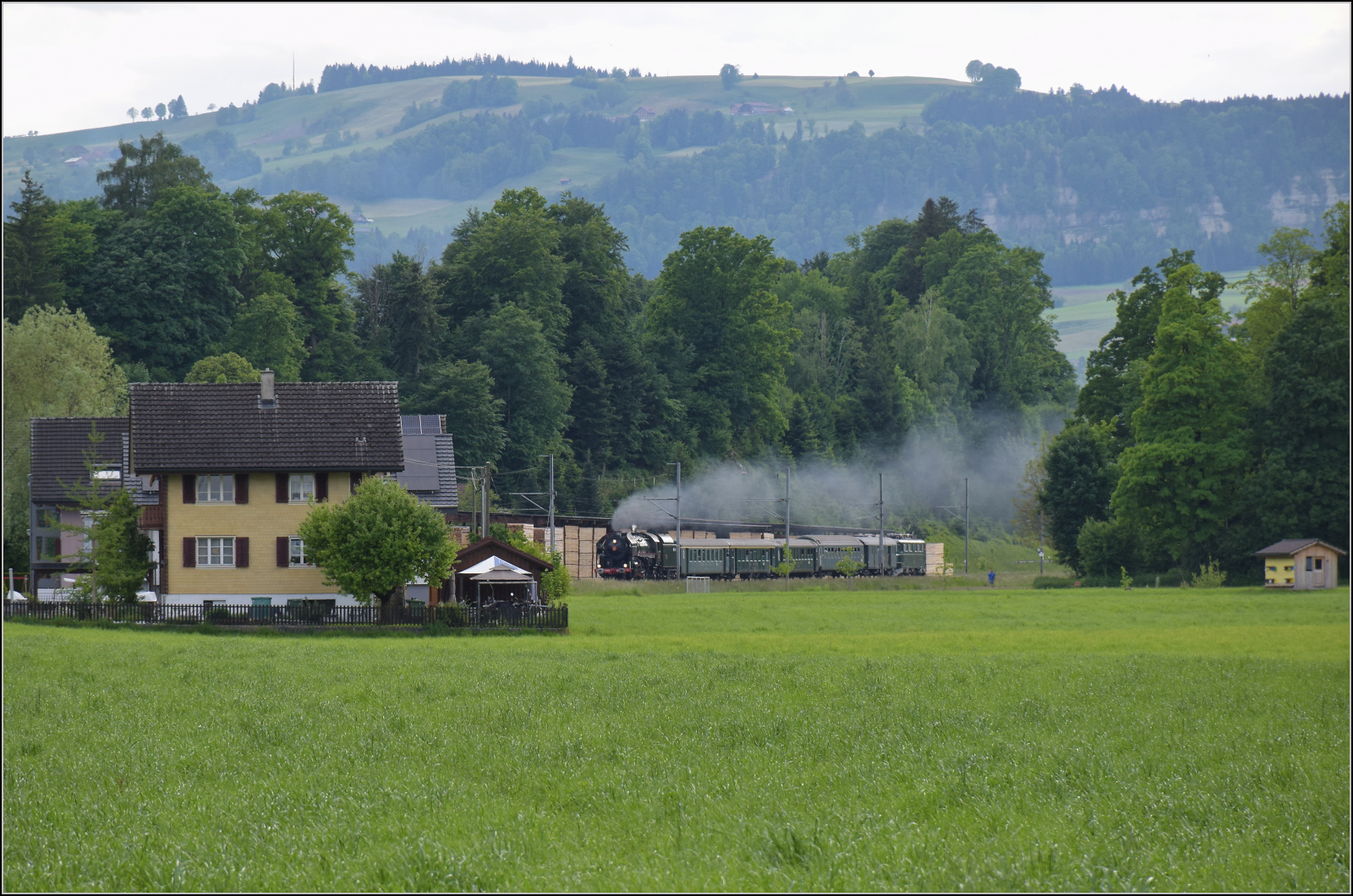 E 3/3 853 der Jura-Simplon und Ed 3/3 3 'Langnau' der Emmentalbahn mit ihrem Sonderzug unterwegs auf der Bern-Luzern-Bahn. Konolfinger Moos, Mai 2025.