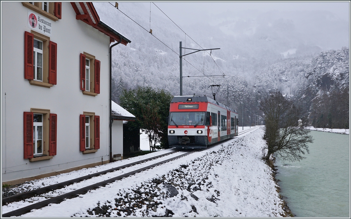 Der MIB (?) ex CJ BDe 4/4 11 und der Zentralbahn Be 125 013 stehen in Innertkirchen. Während der GTW Be 2/6 125 013 zwischen zwischen Innertkirchen und Meringen hin- und her pendelt scheint der ex CJ Triebwagen nicht mehr in Betrieb zu sein, wie ein gut ca. 3 x 7 cm2 kleiner Aufkleber am Triebwagen verrät.