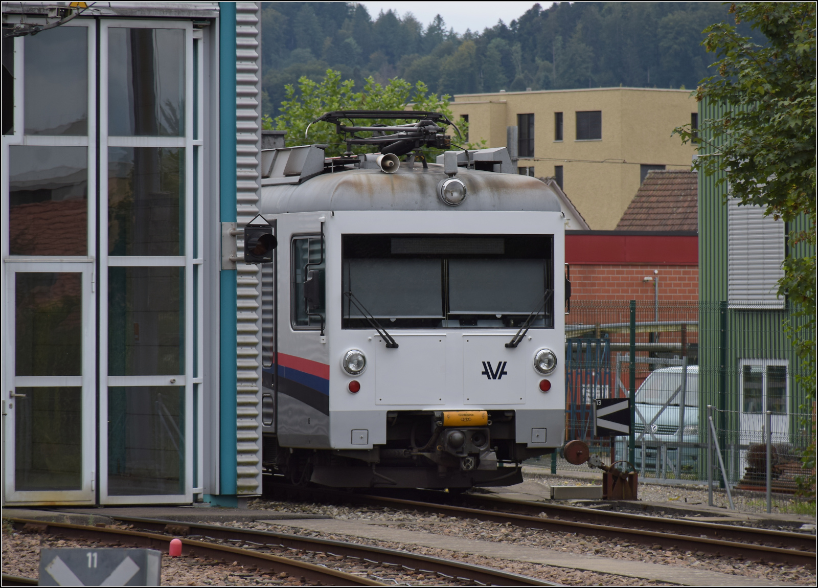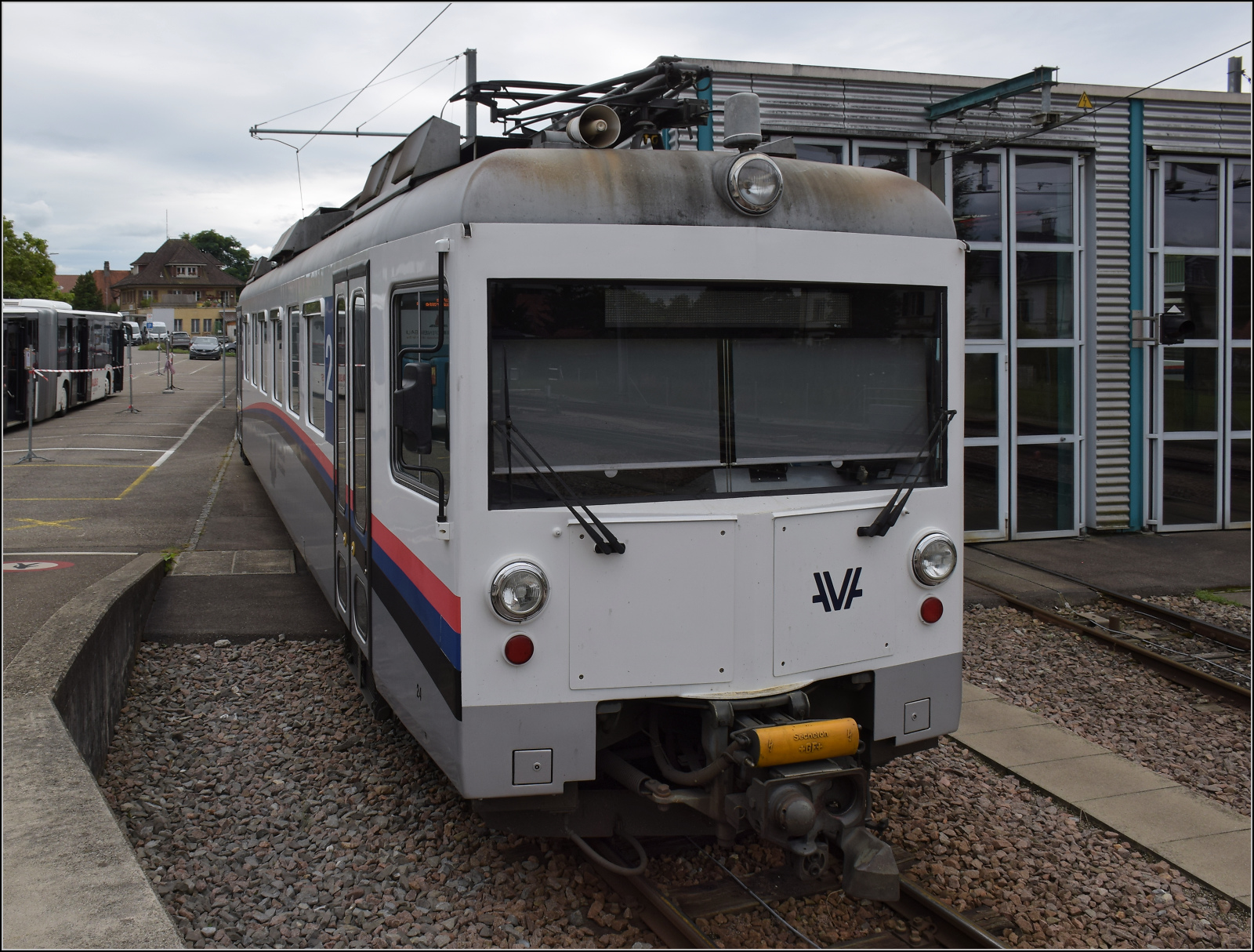 ABe 4/8 33 der WSB mit Bank-Leerau-Werbung fährt in Richtung Aarau Bahnhof. Diese Wagen wurden Anfang der 2010er Jahre mit den kürzeren Wagen der BDWM neu kombiniert. Nur dieser Zug besteht aus zwei langen Wagen ex 33 und 34 der WSB, heute AVA. August 2024.