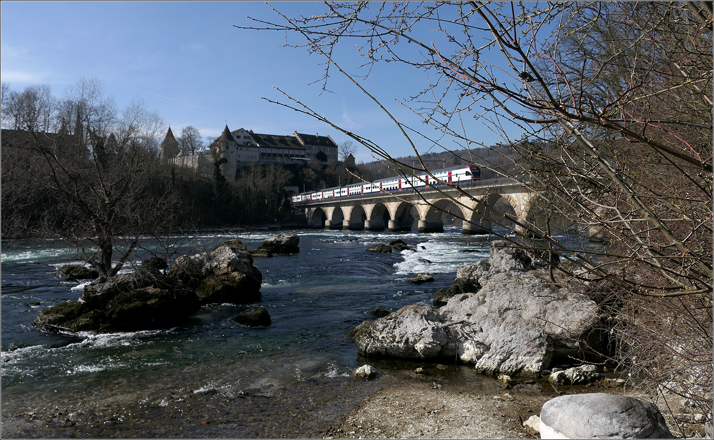 511 043 als S33 nach Schaffhausen verlässt den Tunnel unter dem Schloss Laufen am Rheinfall und fährt über die Rheinbrücke. Eigentlich hatte ich gedacht, die Brücke wäre frei von Vorhängeschlössern, aber hier kann ich doch welche erkennen.