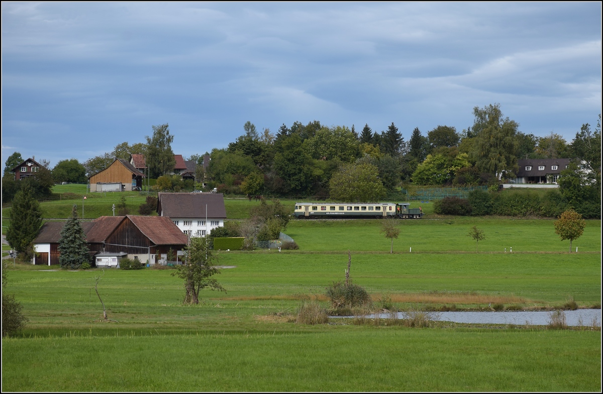 In der Wiese beim Ritterhaus Bubikon sei ein näherer Blick auf den Tm 2/2 111 und den ABt der Wolfhuuser Bahn gestattet. Für Velotransporte gibt es noch einen kleinen  Beistellwagen . Oktober 2021.