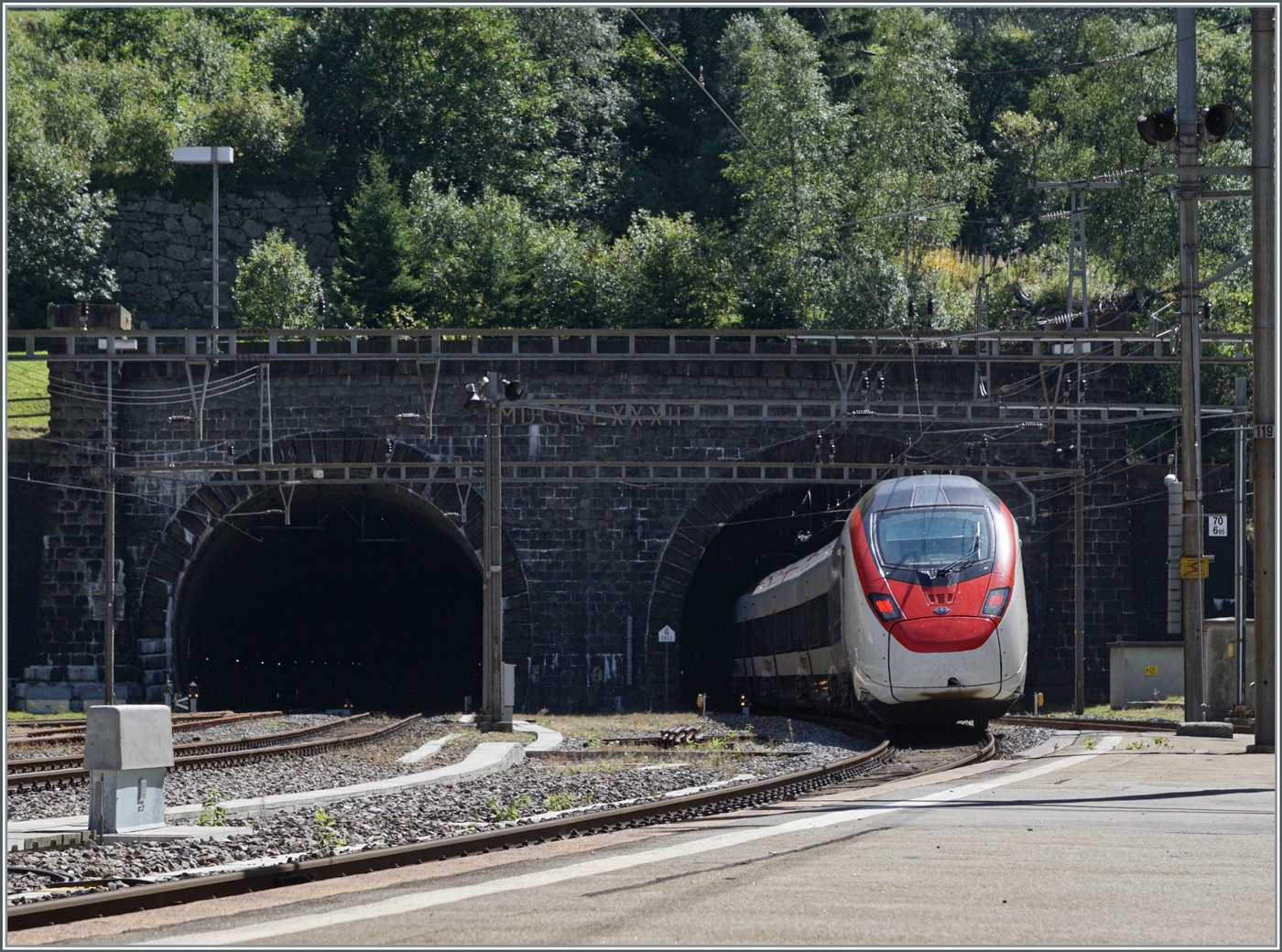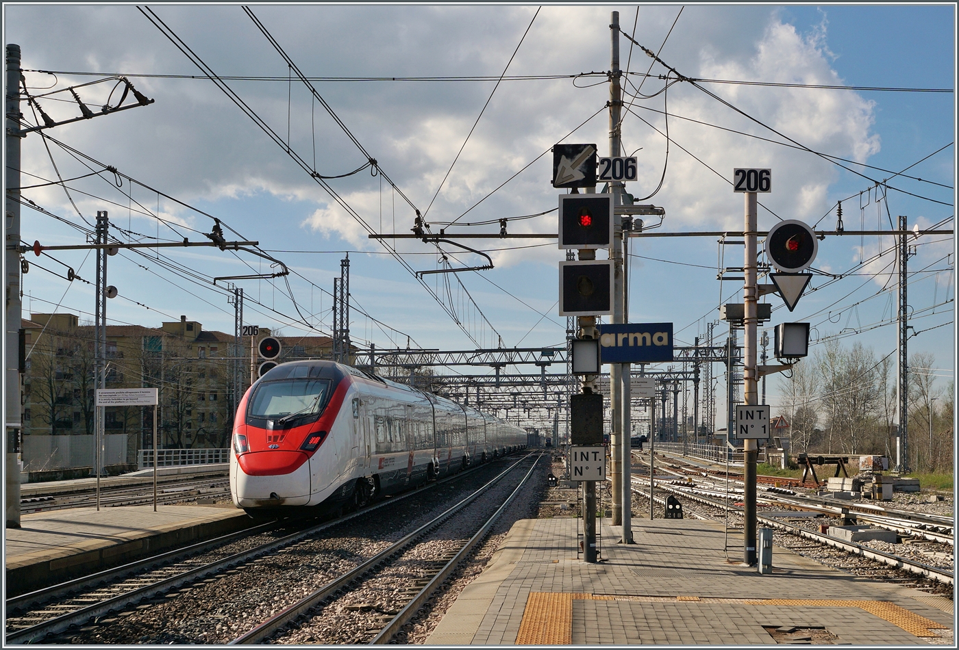 Der SBB Giruno RABe 501 007"URI" ist als EC 307 von Zürich nach Bologna unterwegs verlässt Parma.
