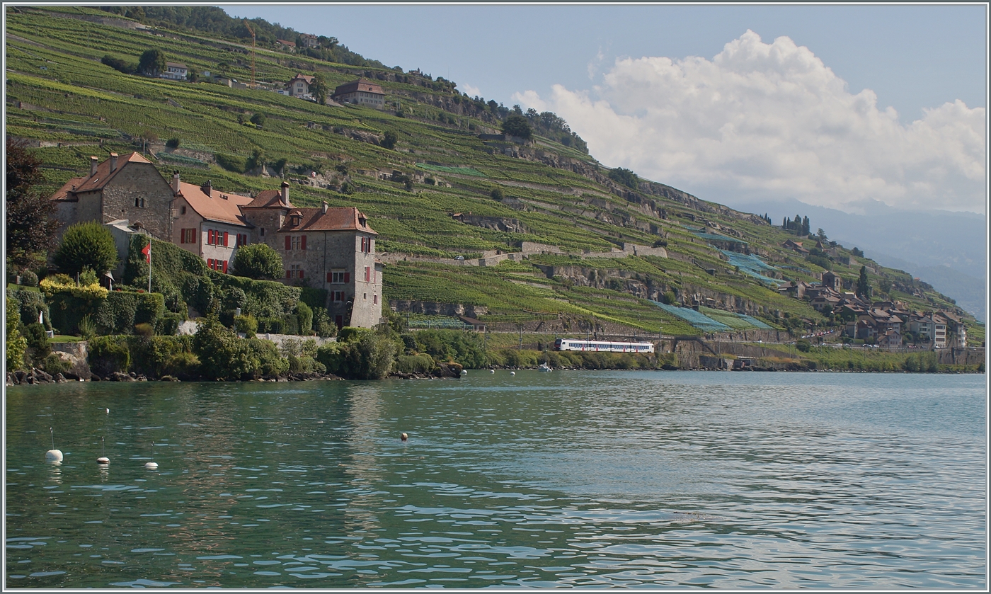 Während der SBB RABe 523 110 und ein weiterer bei Rivaz in Richtung Lausanne fahren, legt der CGN Raddampfer "Itailie" an der Schiffsanlegestelle Rivaz St-Saphorin an.