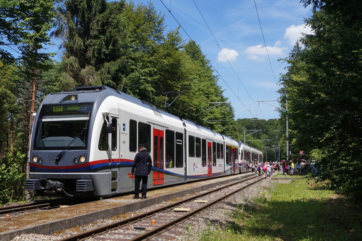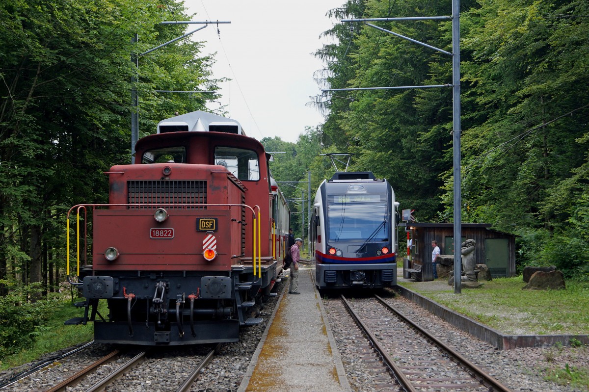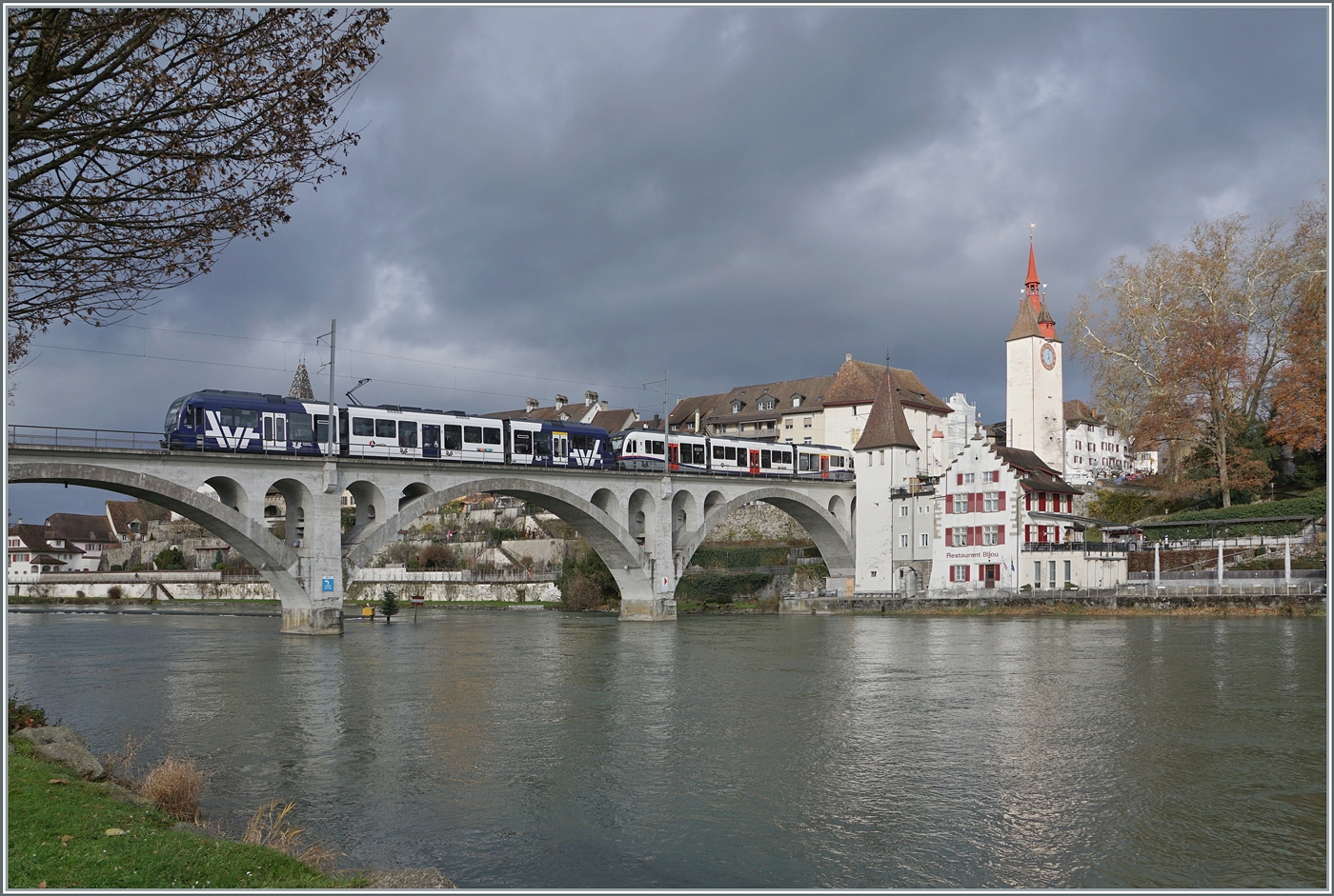 Zwei AVA BDWM ABe 4/8 "Diamant" in unterschiedlicher Farbgebung sind als S17 kurz nach der (während des Weihnachtsmarktes nicht bedienten Haltestelle) Bremgarten Obertor bei geradezu dramatischen Lichtverhältnissen auf der Fahrt von Dietikon nach Wohlen und überqueren dabei die fotogene 156 Meter lange Reussbrücke.