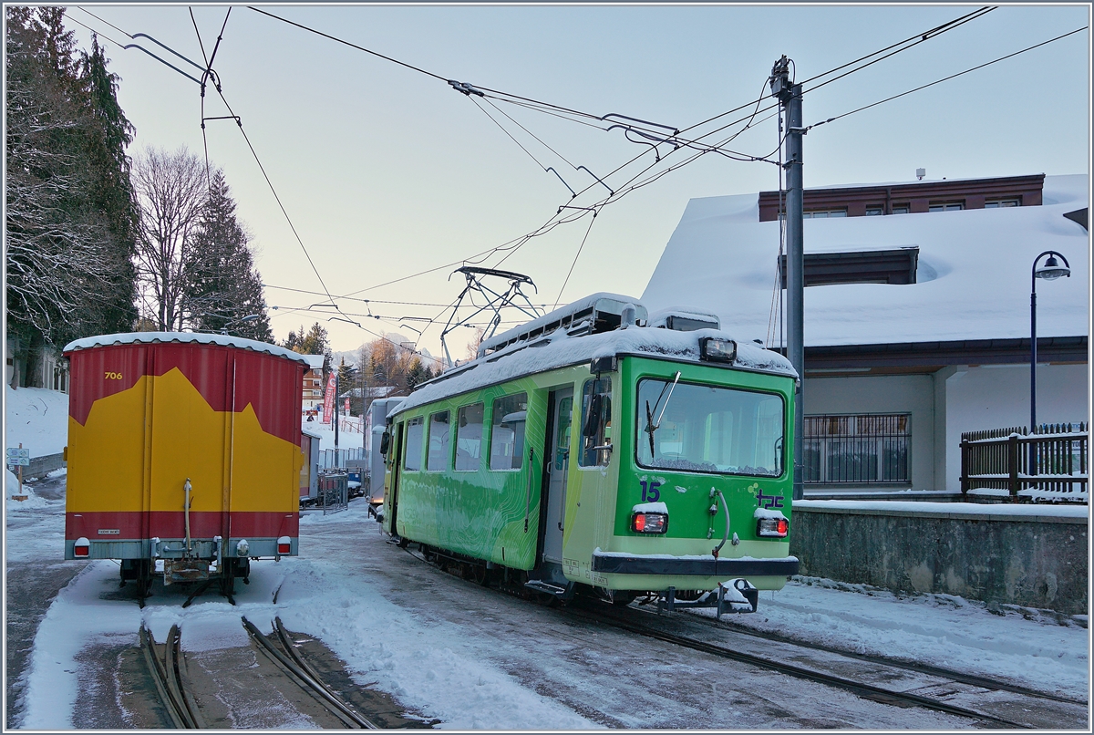Der wartende TPC BVB BDeh 4/4 82 und der rangierende Be 2/3 15 in Villars sur Ollon.