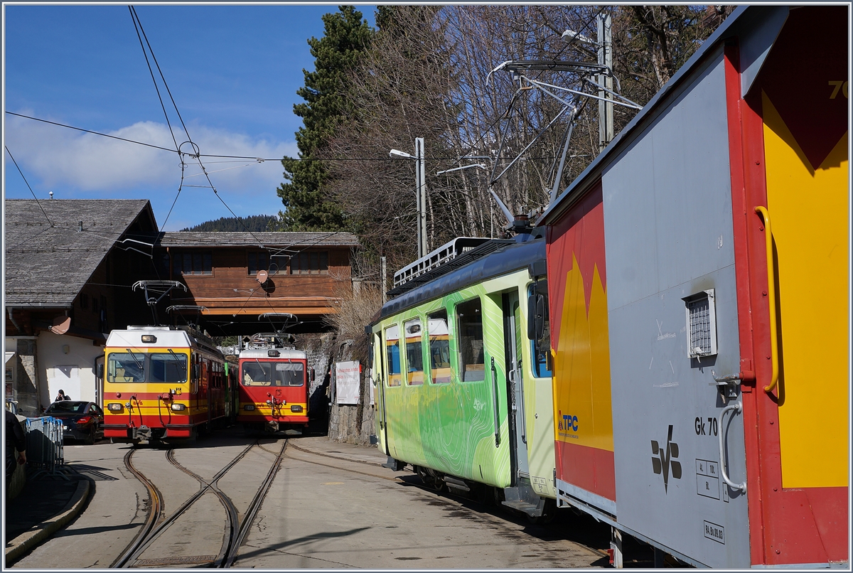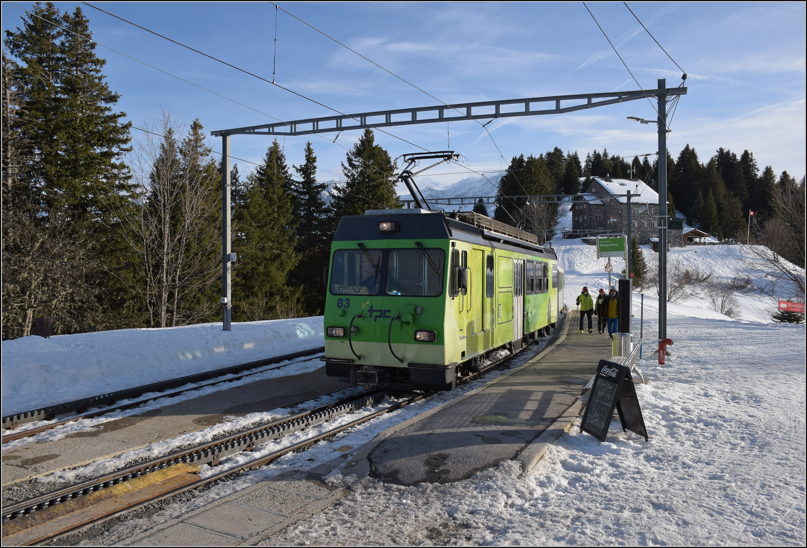 Der Triebwagen BDeh 4/4 82 wurde von SWP/SLM/SAAS im Jahr 1977 an die BVB geliefert und ist wartet am Col de Bretaye mit zwei (Ultraleicht-) Wagen auf die Talfahrt. Wir dürfen nicht sitzen bleiben und müssen einmal um den Block durch die Kontrolle. Col de Bretaye, Januar 2026. Olli
