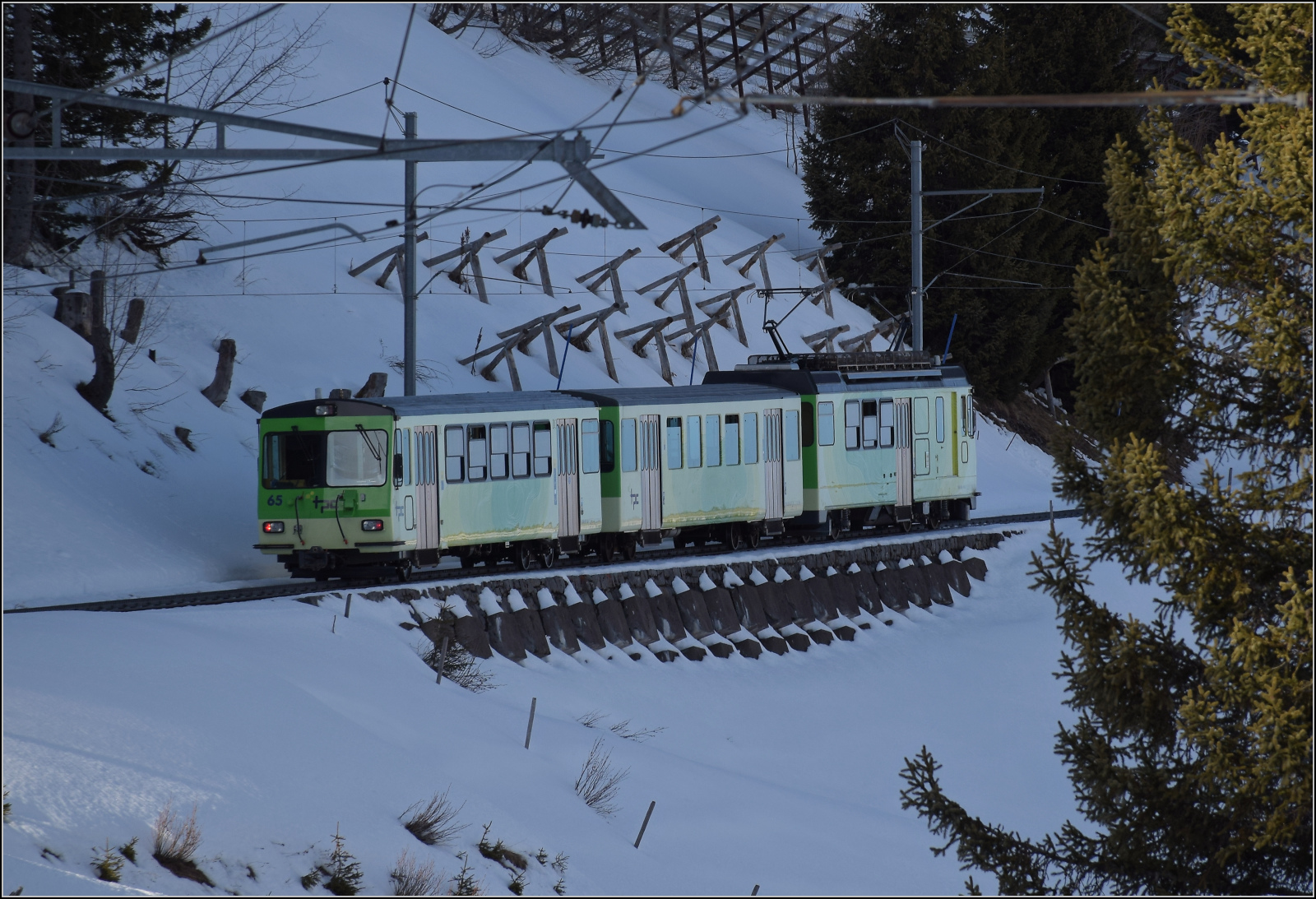 BDeh 4/4 83 auf Bergfahrt mit zwei Wagen. Dieser wurde 1987 von ACMV/SLM/BBC an die BVB geliefert. Die Führerstandsfront des Motorwagens ist ähnlich den zahnlosen Motorwagen von AB, CJ und FW gestaltet, die in den 1980er Jahren geliefert wurden. Angehängt sind die beiden (Ultraleicht-) Wagen B 66 und Bt 65 aus den Jahren 1983 und 1987 von den Herstellern ACMV/SIG/BBC. Bouquetins, Januar 2026. Olli