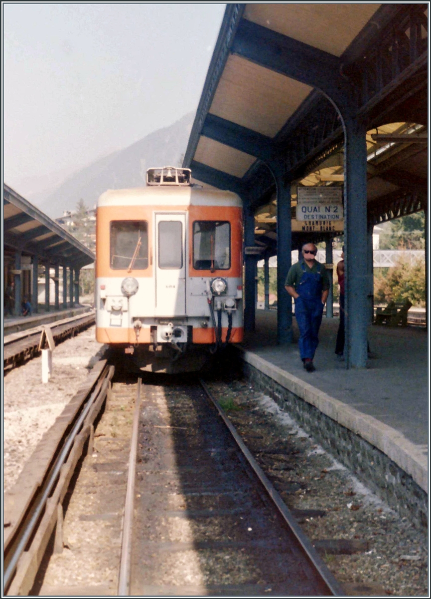 Der TMR Beh 4/8 71 erreicht als Regionalzug 26220 von Martigny kommend sein Ziel Vallorcine. Rechts im Bild das Ausfahrtsignal C 110 welches von der Form und Nummerierung her überraschend schweizerischem Standard entspricht, während links im Bild die Weiche einen typischen SNCF Handweichenmechanismus aufweist.