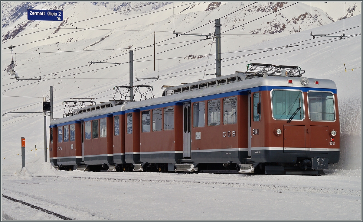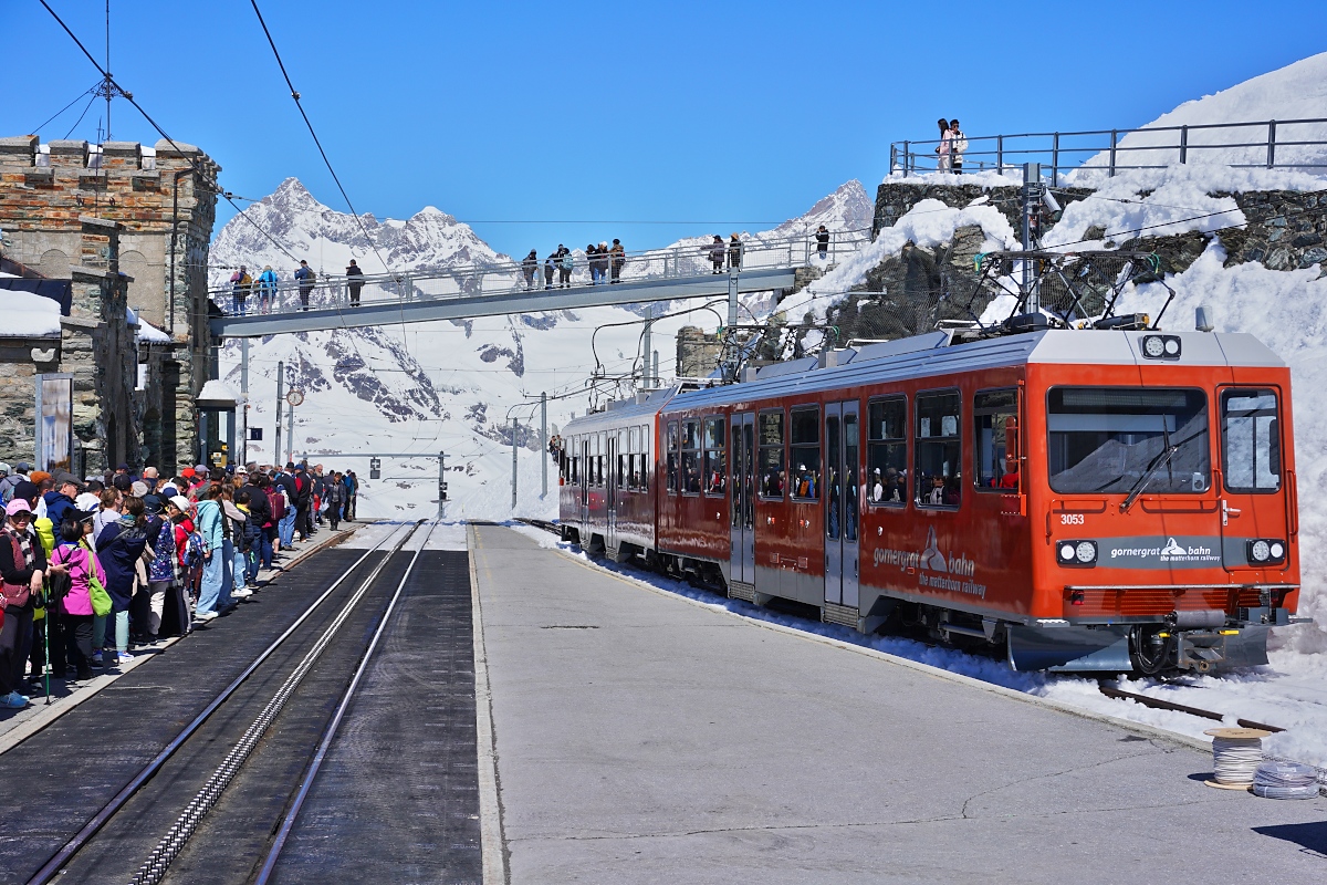 Noch einmal der Bhe 4/8 3053 der Gornergratbahn in der Bergstation, diesmal in Blickrichtung Südost