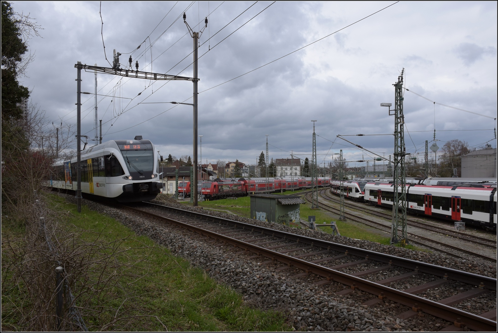 Seelinie Rorschach - Arbon - Romanshorn - Kreuzlingen - Stein am Rhein - Schaffhausen: Kreuzlingen am 16.August 2001. Im Vergleich zum Bild vom 5.Oktober 2021! Links Lok 477 909, rechts ein Pendelzug der damaligen Mittelthurgau Bahn.