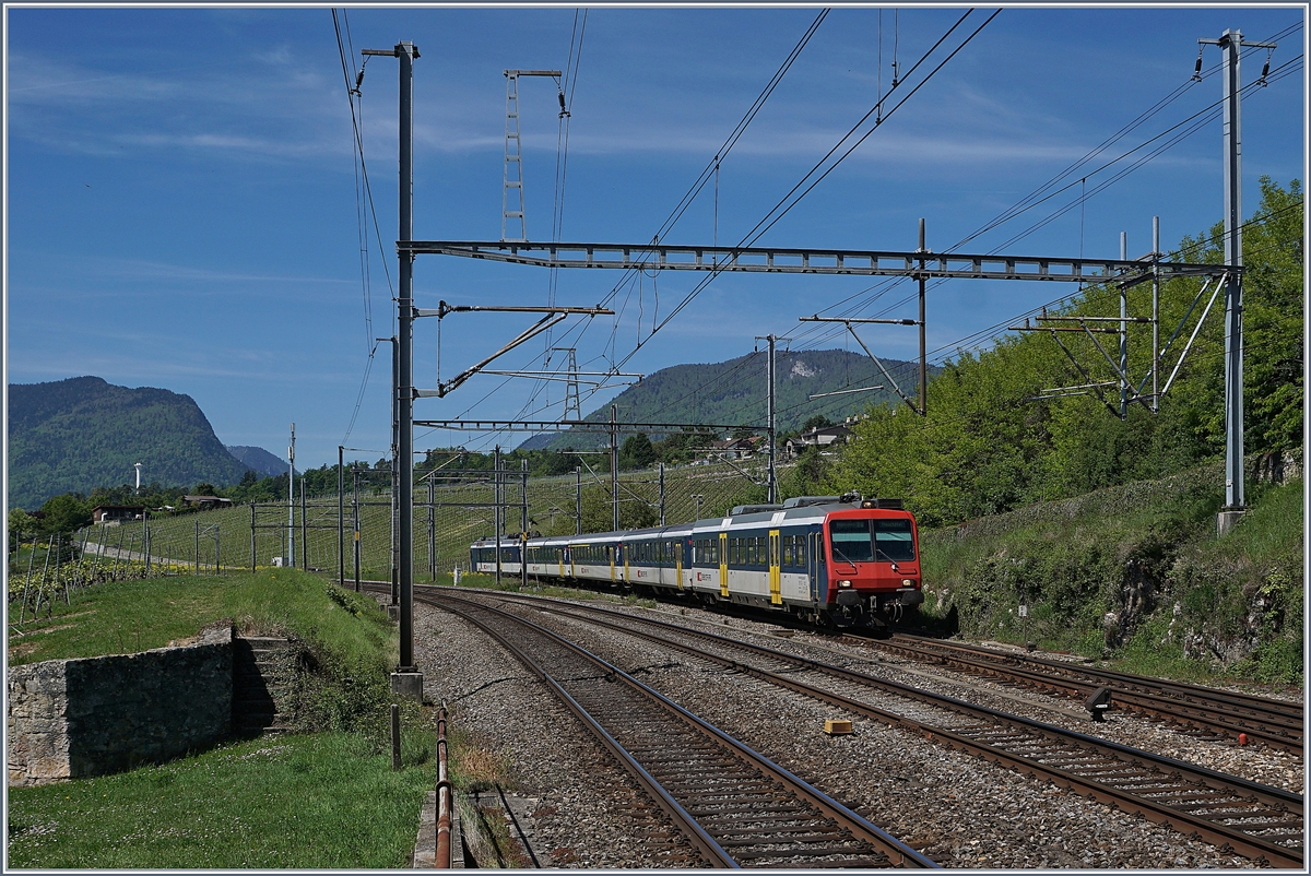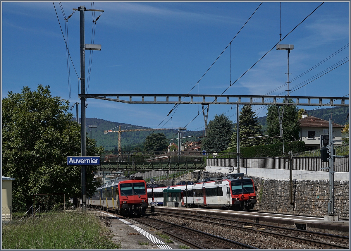 Reger Verkehr in Auvernier: Während ein traNs Flirt vom Val de Travers kommend Richtung Neuchâtel fährt, kommt aus der Gegenrichtung ein ICN nach Lausanne angefahren. 16. Mai 2017