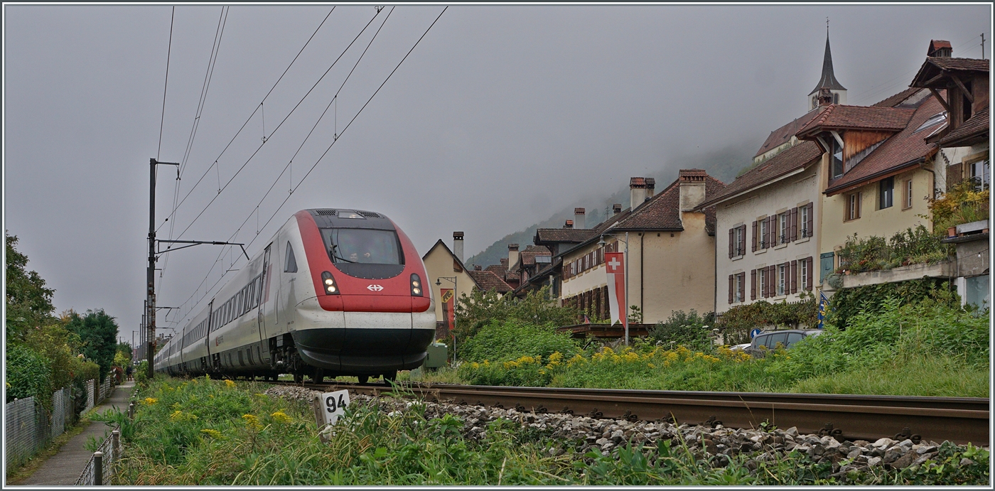 In der Nähe von Schafis sind zwei SBB RABDe 500 als IR5 1519 auf der Fahrt von Lausanne nach St. Gallen Wage ist im Hintergrund die Baustelle für den Neubautunnel bei Ligerz zu erahnen.