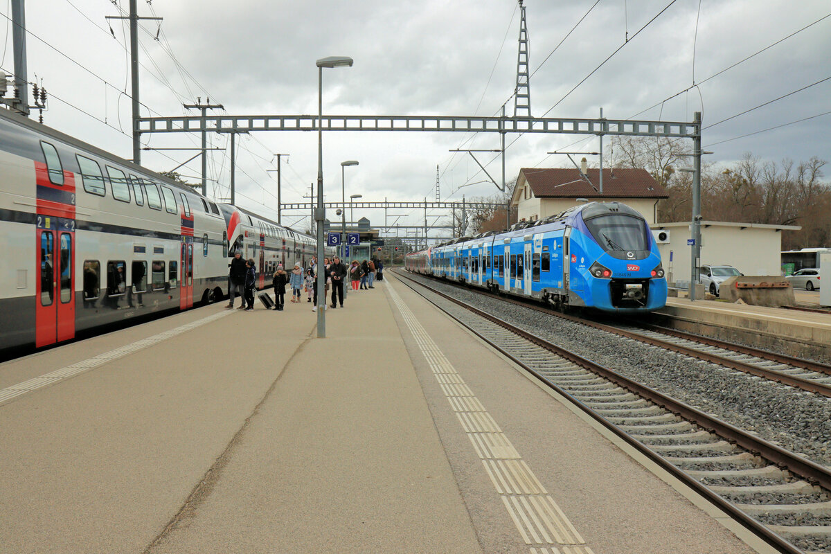 Der SBB RABe 511 036 verlässt nach einem kurzen Halt Coppet als RE in Richtung Annemasse.