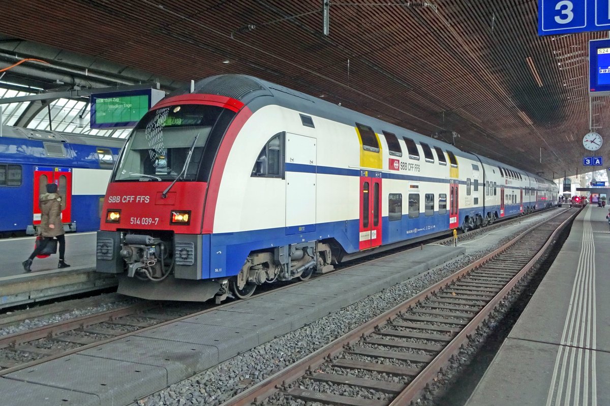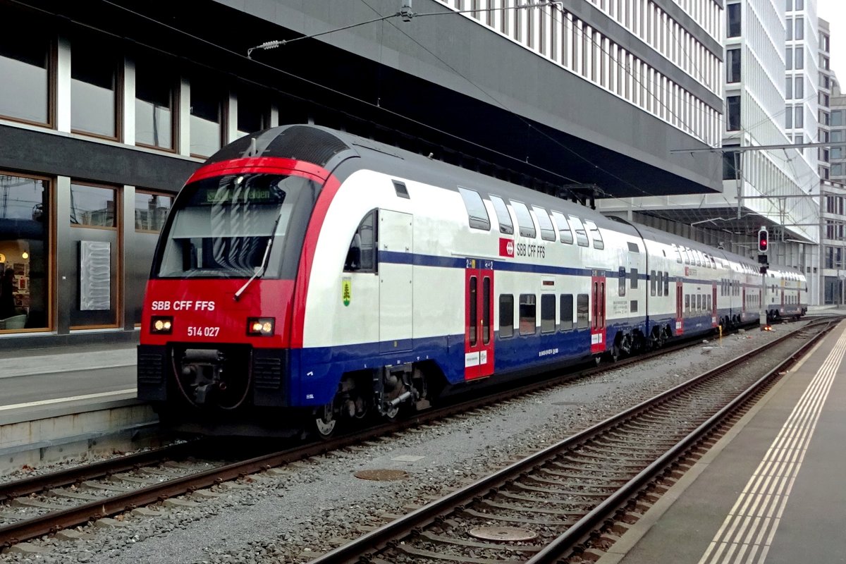 Ein SBB RABe 514 als S 24 von Thayngen nach Zug auf der Rheinbrücke zwischen Neuhausen und Schloss Laufen am Rheinfall.