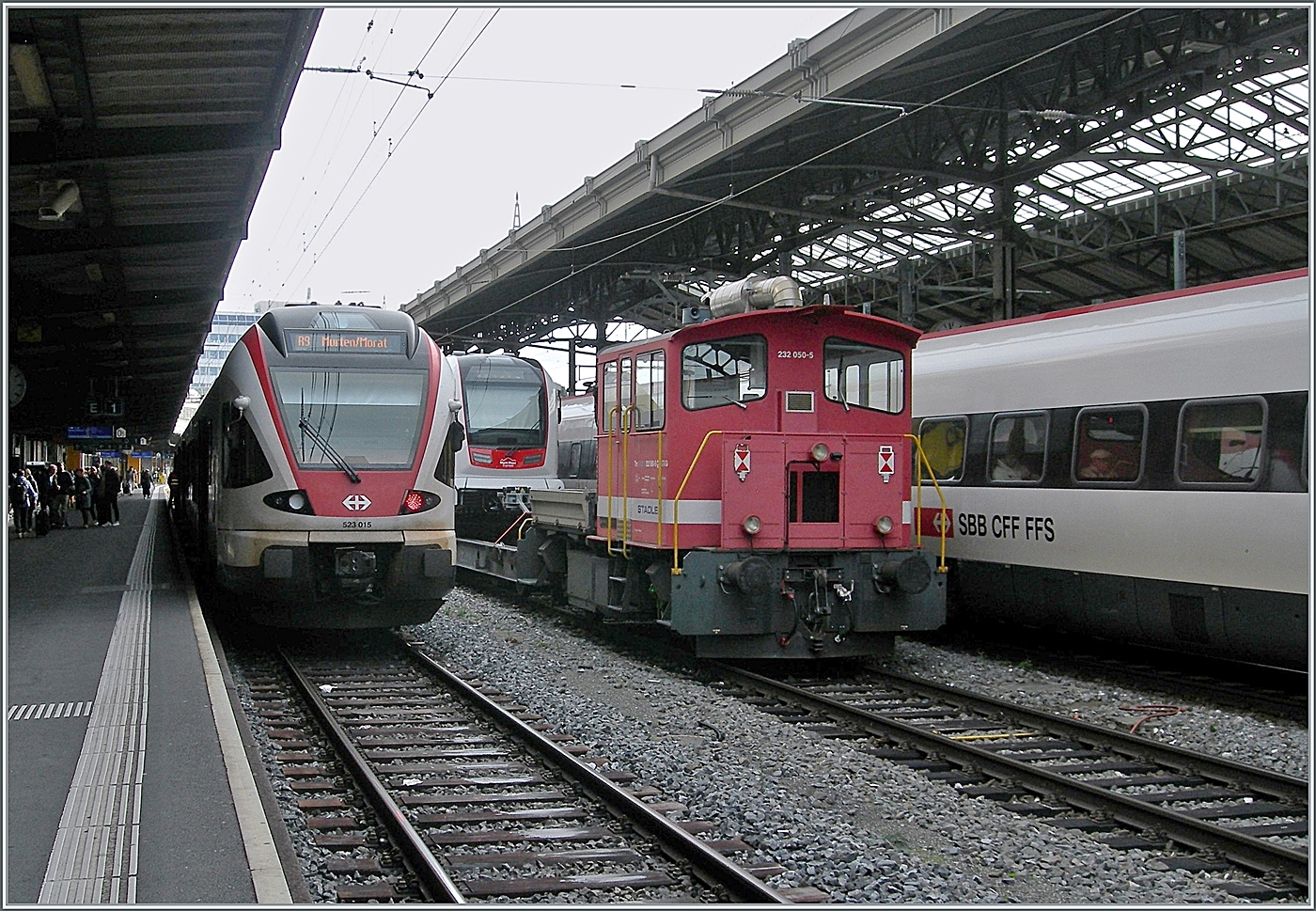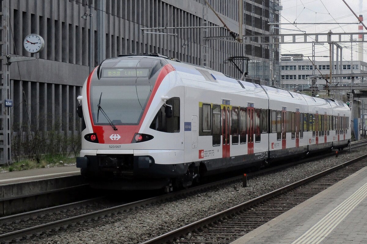 Ein Regionalzug bestehend aus dem SBB RABe 523 104 und einem weiteren Flirt RABe 523.0 ist bei St-Saphorin auf der Fahrt in Richtung Aigle.