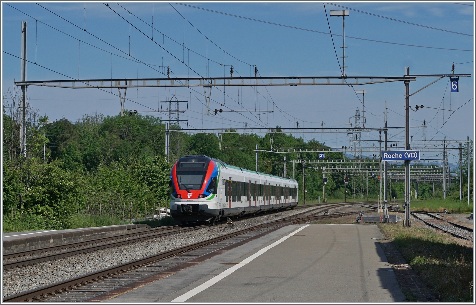Der SBB Flirt 524 009-8 als RER 96716 Genève - La Plaine, erreicht Russin.