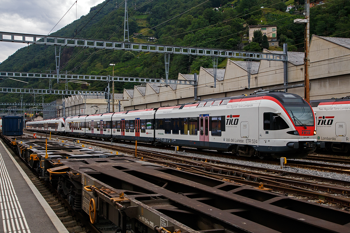 Der vierteilige Stadler FLIRT RABe 524 006 / ETR 524 006 „Valli del Luinese“ und weitere der TiLo (Treni Regionali Ticino Lombardia) stehen am 02.08.2019 beim Bahnhof Bellinzona. Die TILO SA (Treni Regionali Ticino Lombardia) ist ein Tochterunternehmen der SBB und der Trenord mit Sitz im schweizerischen Bellinzona. TILO betreibt Regionalverkehr grenzüberschreitenden Verkehr im Tessin und der Lombardei. Die 23 vierteiligen (SBB RABe 524 001-019, Trenord RABe 524 201-204) und 17 sechsteiligen (SBB RABe 524 101-117) FLIRT sind als Zweisystemfahrzeuge auf den Regionalnetzen im Tessin und in der Lombardei im Einsatz. Diese Stadler FLIRT sind Zweisystem-Triebzüge mit Wechsel- und Gleichstromausrüstung sowie Zugsicherung für die Strecken in der Schweiz und in Italien. Sie besitzen luftgefederte Trieb- und Laufdrehgestelle. Ein durchgängiger Passagierraum, optimiert auf eine Bahnsteighöhe von 550 mm, ein hohes Beschleunigungsvermögen und der grenzüberschreitende Verkehrseinsatz sind drei der herausragenden Merkmale des Zuges. TECHNISCHE DATEN diese vierteiligen Varianten: Baujahre: 2007 / 2014 Spurweite: 1.435 mm (Normalspur) Achsanordnung: Bo’2’2’2 Bo’ Länge über Kupplung: 74.078 mm Drehzapfenabstand: 16.000 mm Fahrzeugbreite: 2.880 mm Fahrzeughöhe: 4.150 mm Eigengewicht: 133 t Achsabstand im Drehgestell: 2.700 mm (Motor- und Laufdrehgestell) Triebraddurchmesser, neu: 860 mm Laufraddurchmesser, neu: 750 mm Speisespannung: 15 kV AC / 3 kV DC Dauerleistung am Rad: 2.000 kW Max Leistung am Rad: 2.600 kW Anfahrzugskraft (bis 47 km/h): 200 kN Anfahrbeschleunigung: 1,2 m/s2 Höchstgeschwindigkeit: 160 km/h Fußbodenhöhe: 570 mm (Niederflur am Einstieg) / 1.120 mm (Hochflur) Einstiegstüren pro Seite: 6 (je 1.300 mm breit) Sitzplätze: 28 (1.Klasse) / 135 (2.Klasse) + 19 Klappsitze Stehplätze (4 Pers./m²): 243 WC: 1 geschlossenes WC-System, Behindertengerecht Bremse: Ch-C-pn-R-A-E-Mg Quelle: Stadler Rail und Anschriften