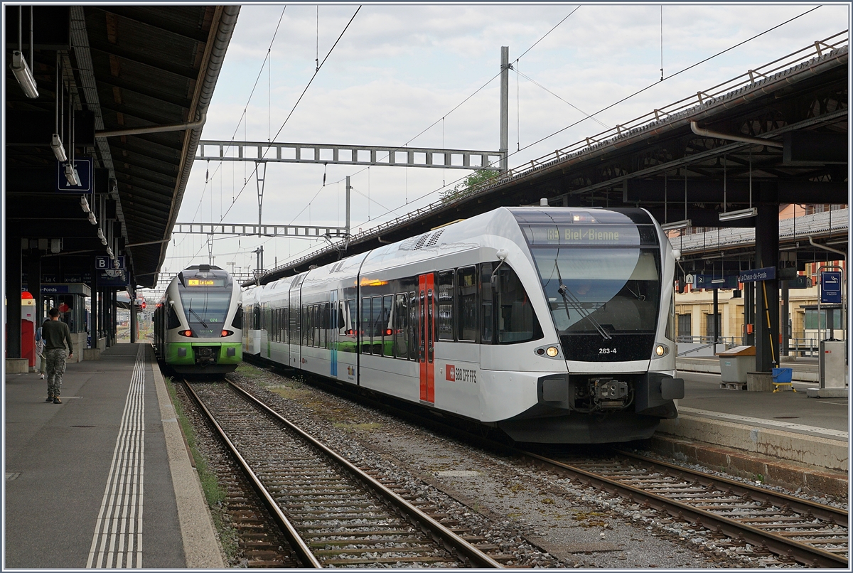 Eher ungewohnt, Thurbo GTW RABe 526 im Jura, genauer gesagt in La Chaux-de-Fonds. Züge dieser Baureihe bedienen die Strecke nach Biel/Bienne.