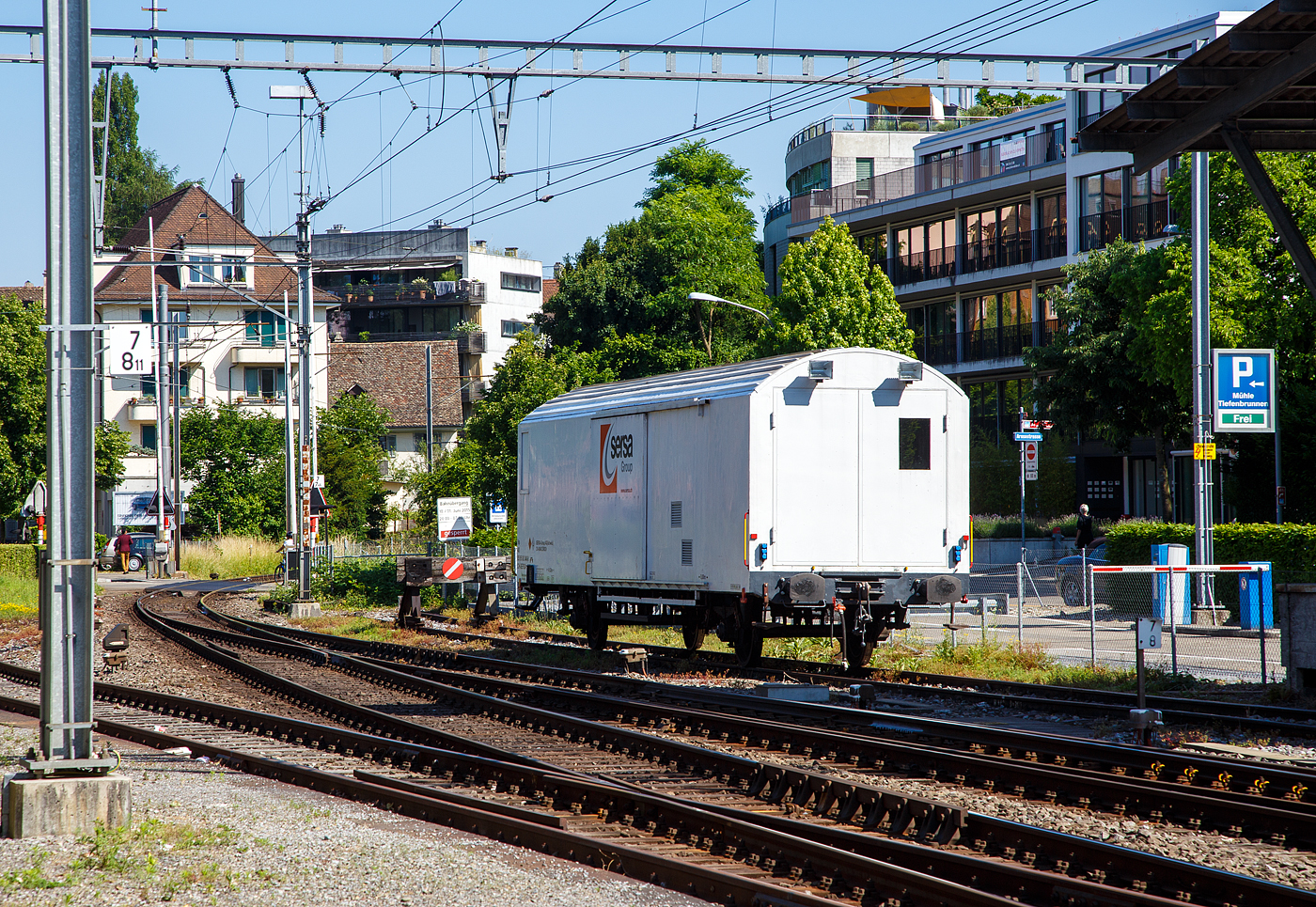 Der zweiachsige Flachwagen mit Seiten- und Stirnwandklappen Xs 99 85 9359 556-9 CH-FAG (Güterwagen Gattung wäre Ks) der Frutiger AG (Thun) abgestellt am 08.09.2021 beim BLS Bahnhof Blausee-Mitholz an der Lötschberg Nordrampe, aufgenommen aus einem Zug heraus.