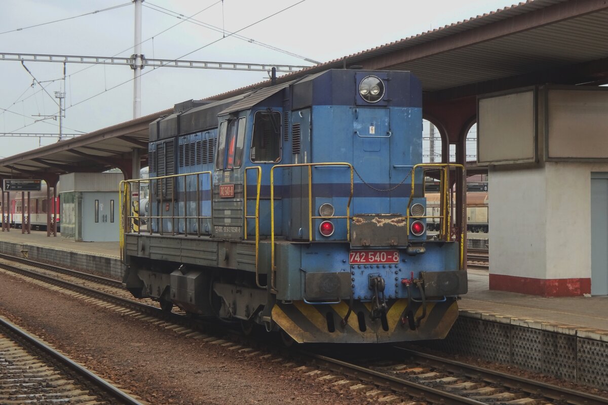 Am Ende einer PSZ Getreidezug schiebt 742 213 mit beim Passage durch Bratislava hl.st. am 31 Mai 2015.