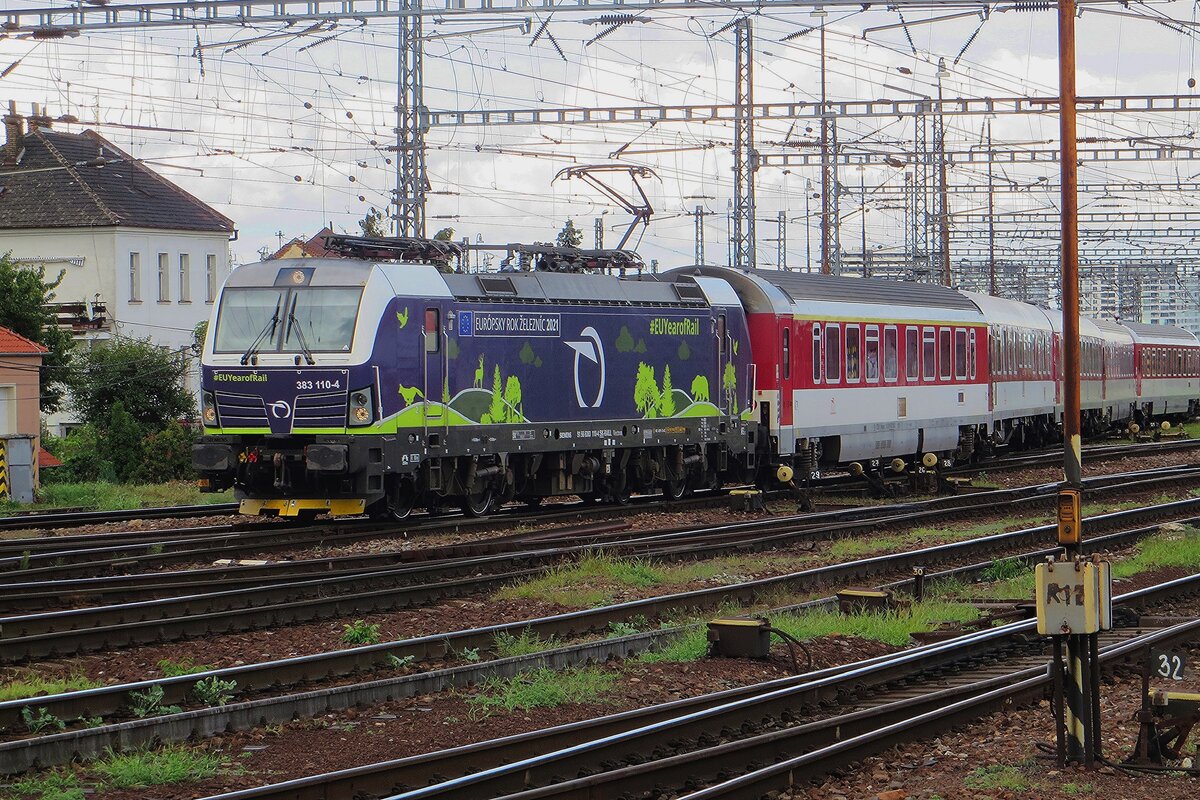 LOK 363 133-0 wartet mit ihrem Zug am Bahnsteig auf das Abfahrtszeichen, während dem läuft Lok 362 015-0 mit Lok 193 215 und D-Lok 2742 167-0 mit langem Güterzug durchfahren den Bahnhof von Bratislava. 05.06.2023Zug in den Bahnhof von Bratislava ein.. 05.06.2023
