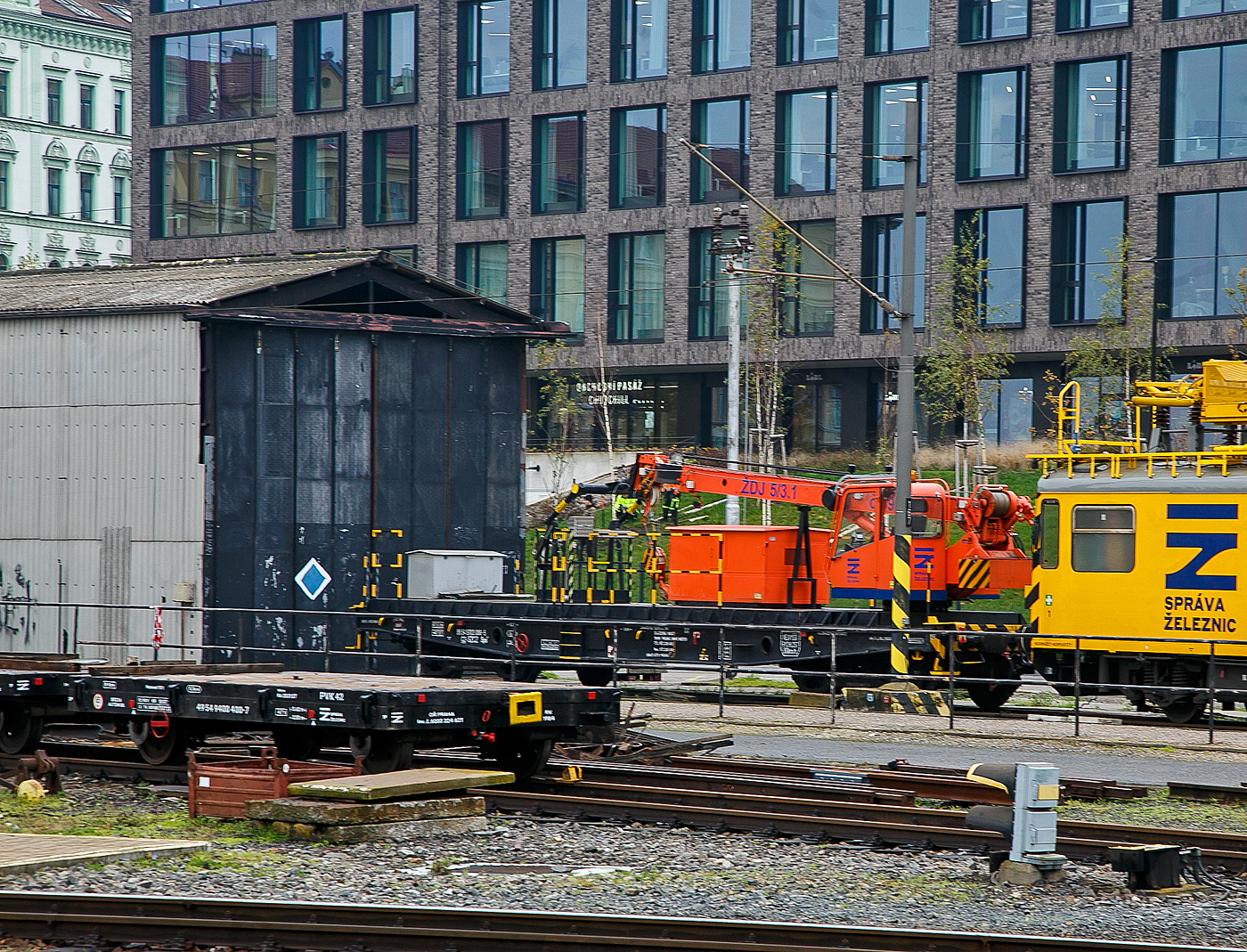 Der Kranwagen ŽDJ 5/3.1 (Kranaufbau AD-10) aufgesetzt auf den Sps Wagen 99 54 9703 006-5 CZ-SZCZ, der Správa železnic (SŽCZ), abgestellt am 23.11.2022 beim Hauptbahnhof Prag (Praha hlavní nádraží).