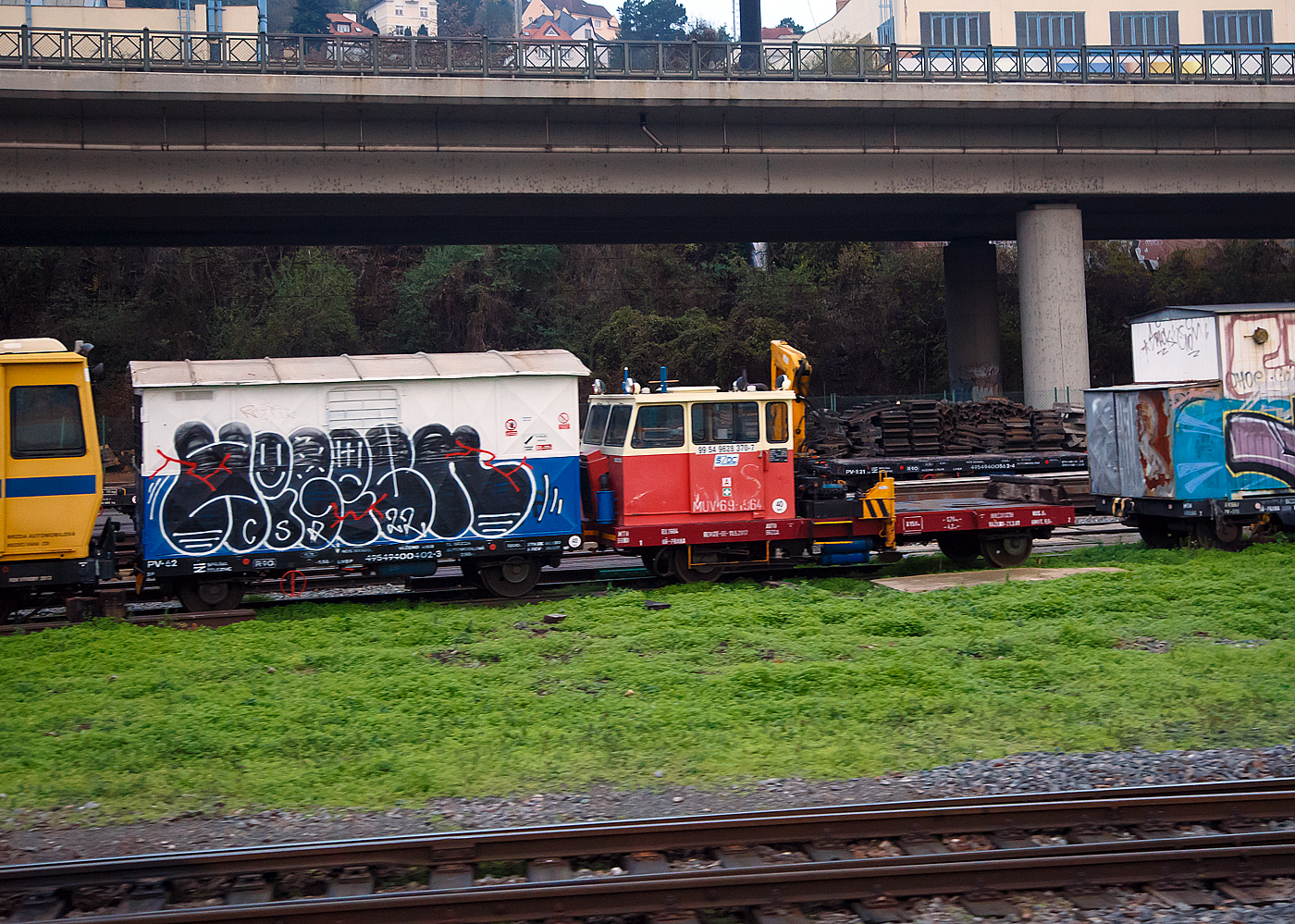Der tschechische Schwerlastkleinwagen mit Kran MUV 69.2 -964 (CZ-SŽCZ 99 54 9628 370-7) der Správa železnic steht am 24.11.2022 bei Praha-Smichov. Davor der zweiachsige (leider beschmierte) Bauwagen PV-69 (CZ-SŽCZ 49 54 9400 402-3).