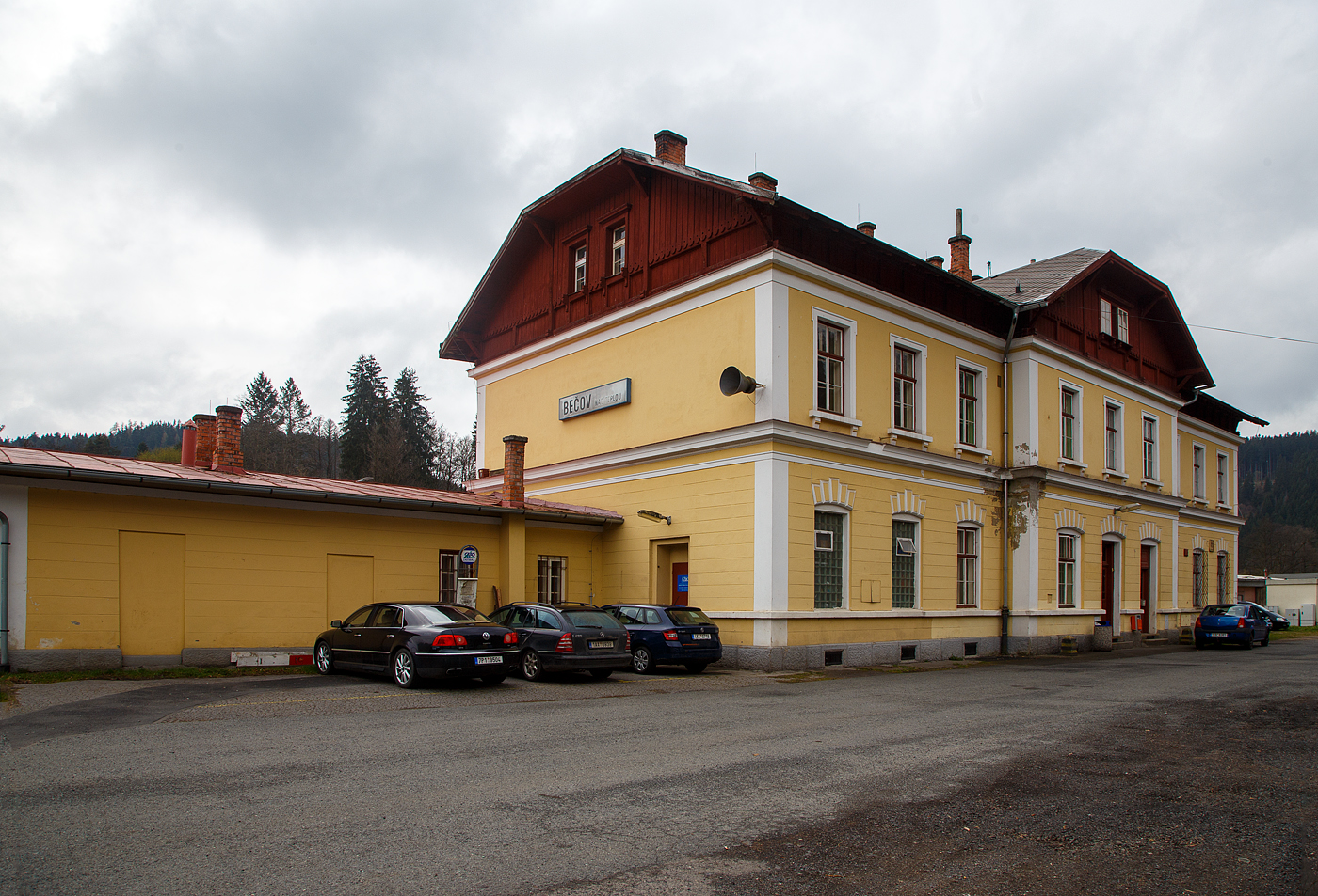Der schöne Bahnhof Bečov nad Teplou (Petschau) der Bahnstrecke Mariánské Lázně–Karlovy Vary (Marienbad–Karlsbad) – SŽDC 149 und Anfangs- bzw. Endpunkt der Bahnstrecken Blatno u Jesenice – Bečov nad Teplou (SŽDC 161), sowie Bečov nad Teplou - Krásný Jez–Nové Sedlo u Lokte (SŽDC 144). Hier am 20.04.2023.