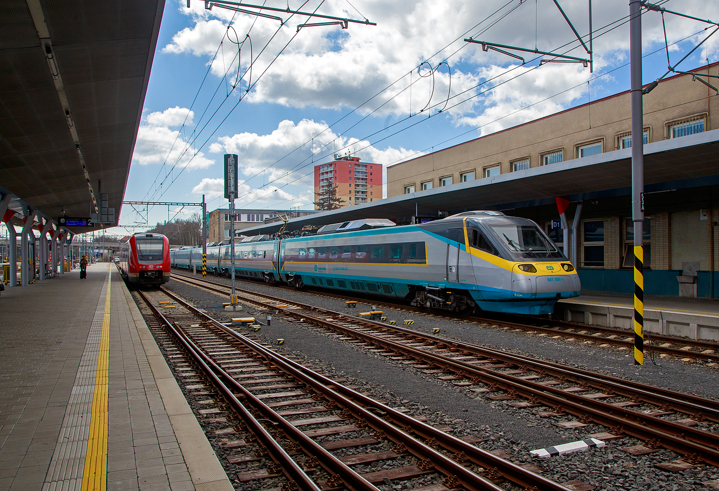 Die an die ČD - České dráhy (Tschechischen Eisenbahnen) vermietete Siemens Vectron MS 193 683-0 (91 80 6193 683-0 D-RAILL) der Lease RSL - Rolling Stock Lease s.r.o.(Bratislava/Slowakei) erreicht am 21.04.2023, mit dem IC 564 „Západní expres“ (Praha/Prag – Plzeň/Pilsen - Mariánské Lázně/Marienbad - Cheb/Eger), pünktlich den Zielbahnhof Cheb.