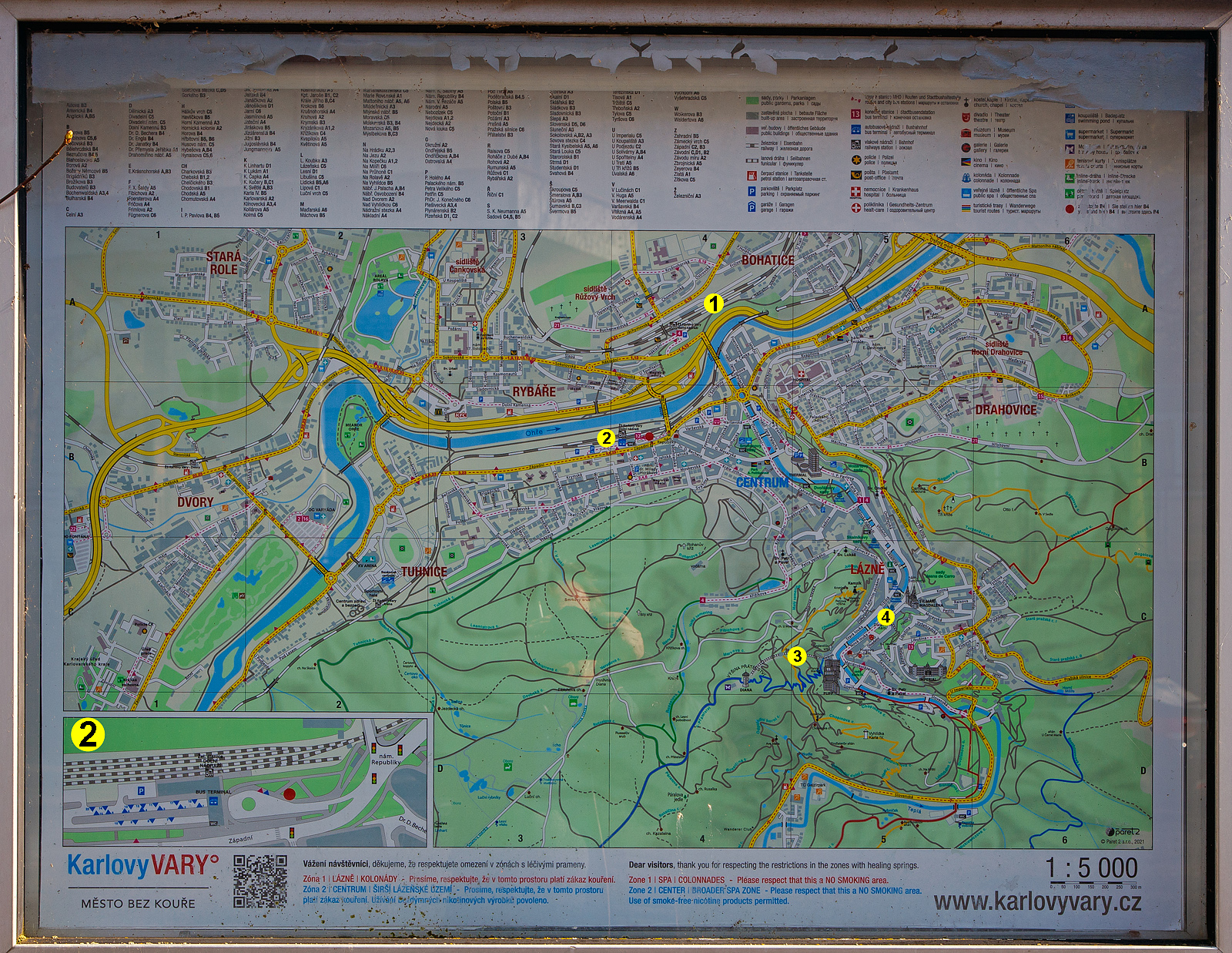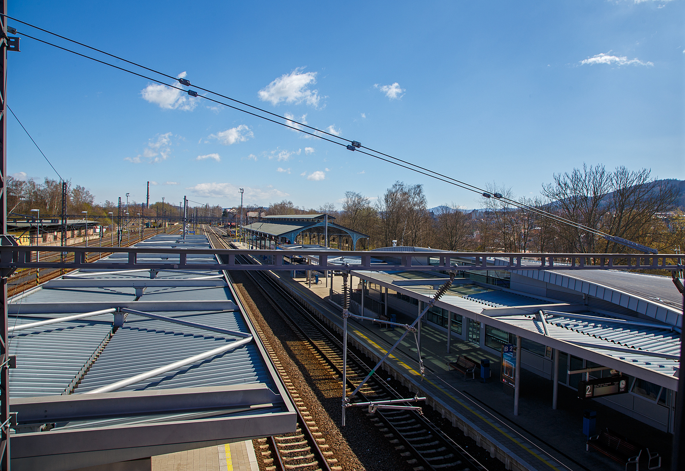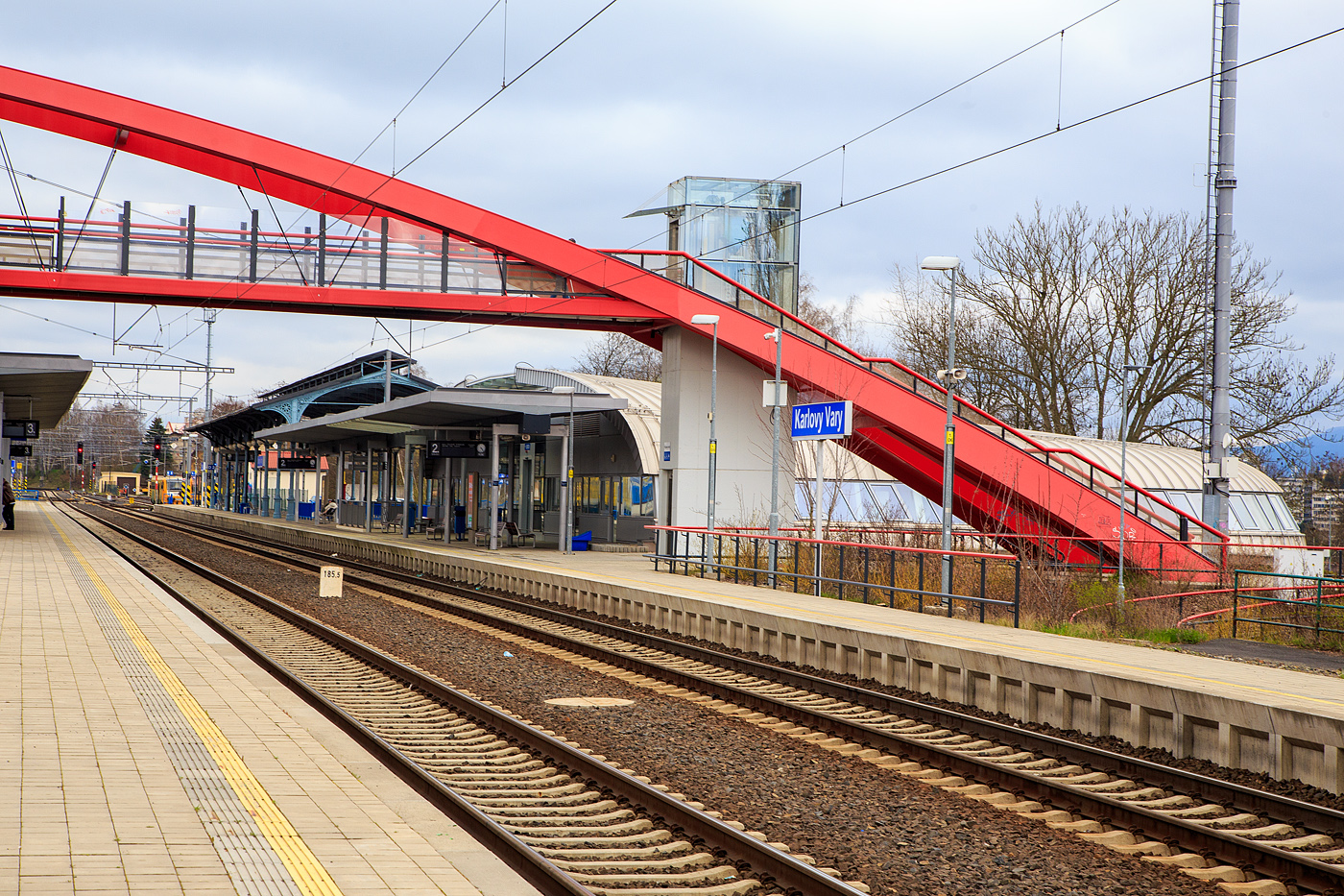 Wohl ein Rest einer Säule (in alter Farbgebung) einer Bahnsteigüberdachungen vom Bahnhof Karlovy Vary (Horním nádražím) / Karlsbad (Oberer Bahnhof), hier am 17.04.2023.