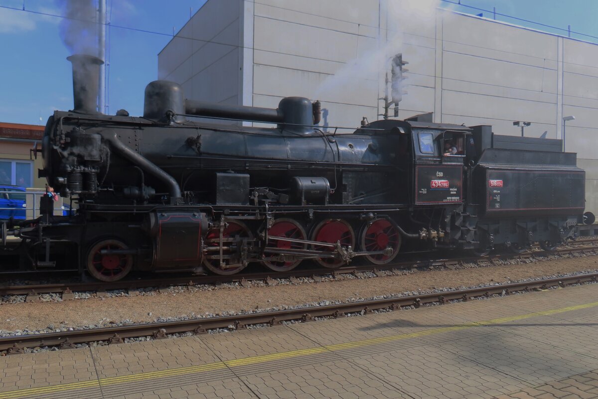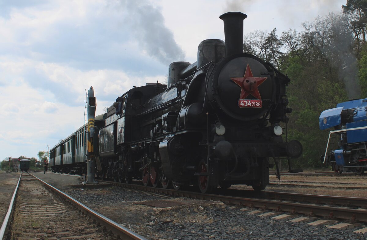 Ex-CSD 434.2186 setzt sich am 27 September 2025 in Benesov u Prahy vor ein Dampfpendelzug während das Museumszugspektakel  STEAM56 .