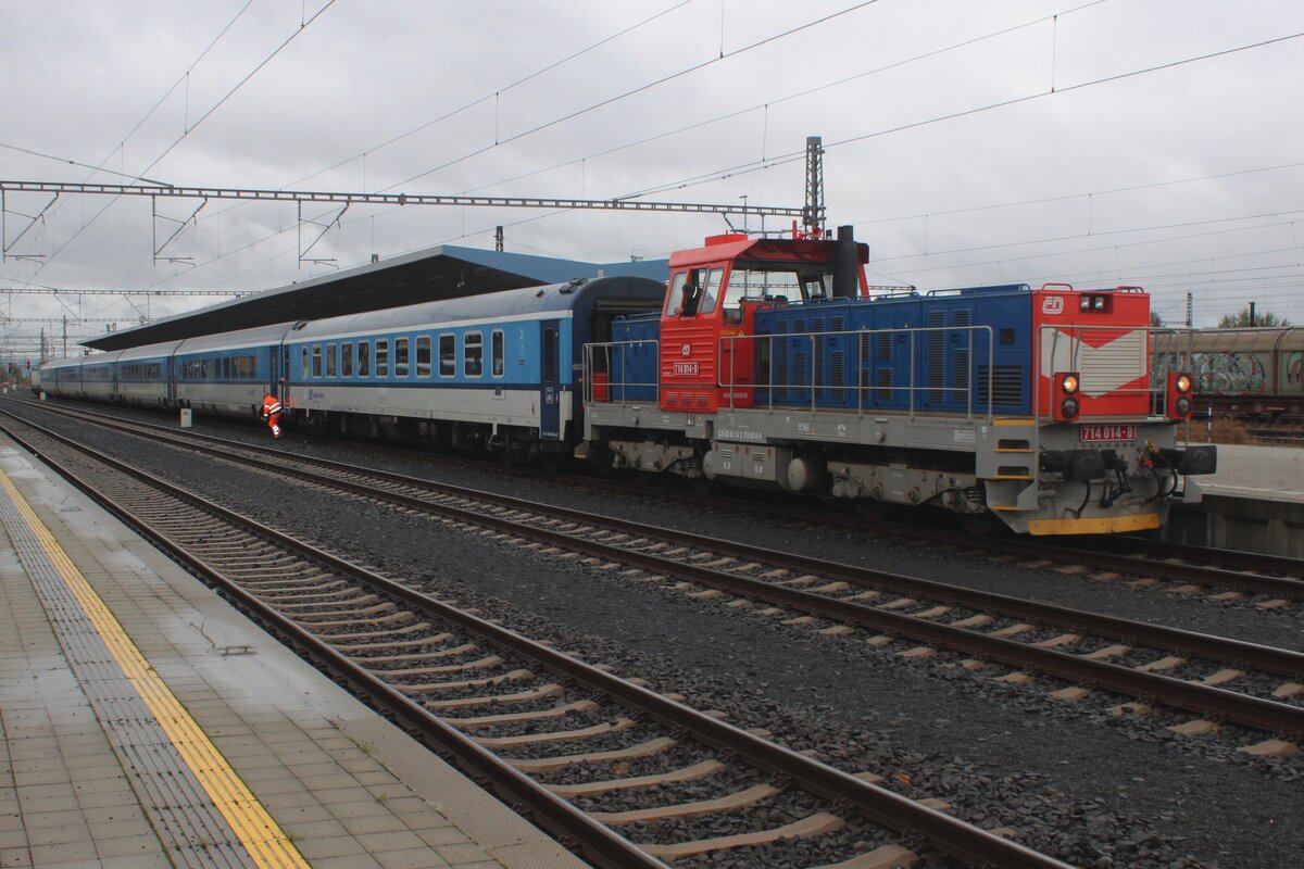 Am grauen 25 September 2025 kuppelt CD 714 014 ein Verstärkerwagen am ComfortJet IC in Cheb.