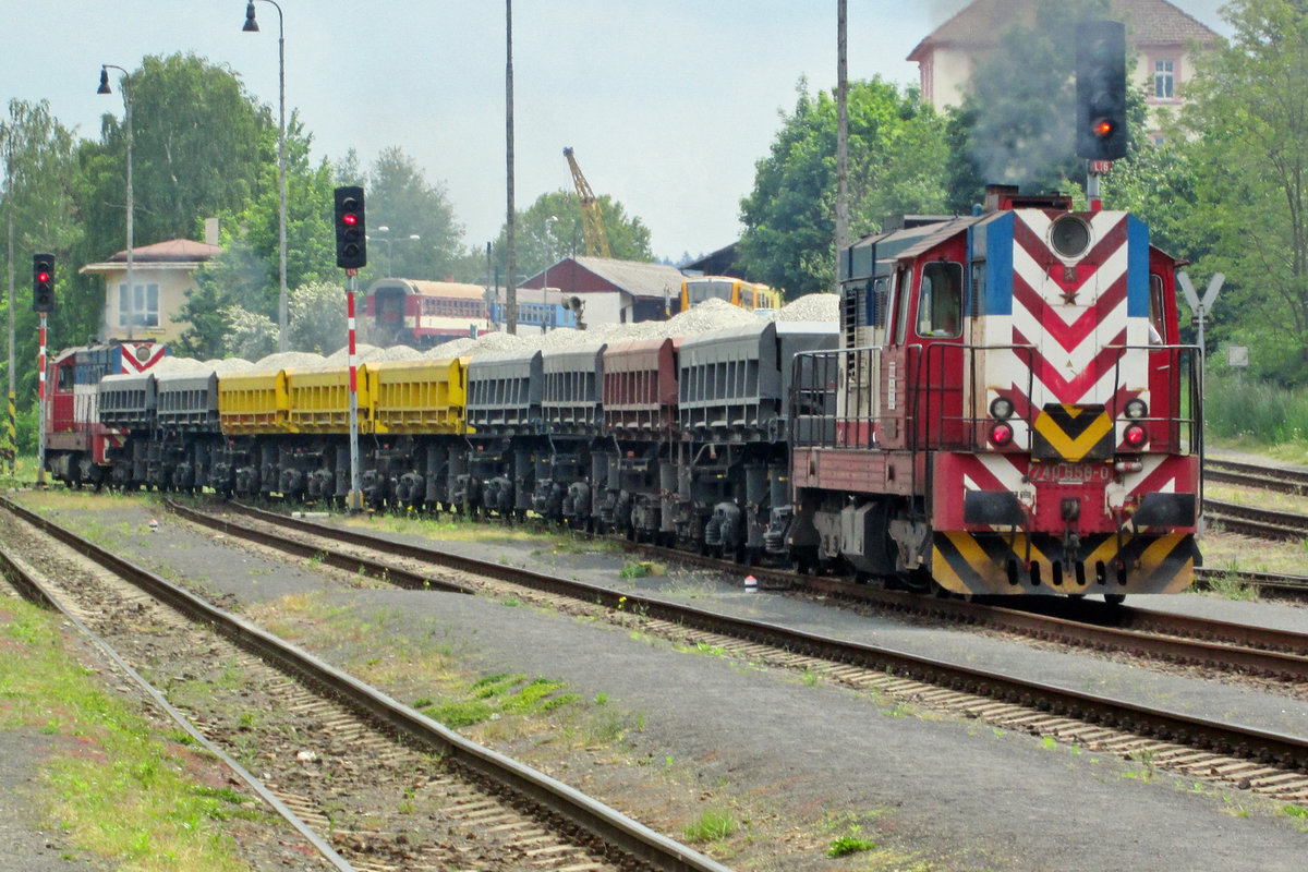 STraBag 740 858 schiebt ein Schötterzug aus Rakovnik aus am 25 Mai 2015.