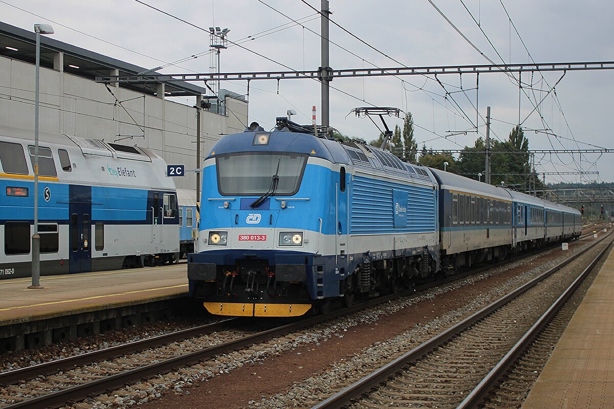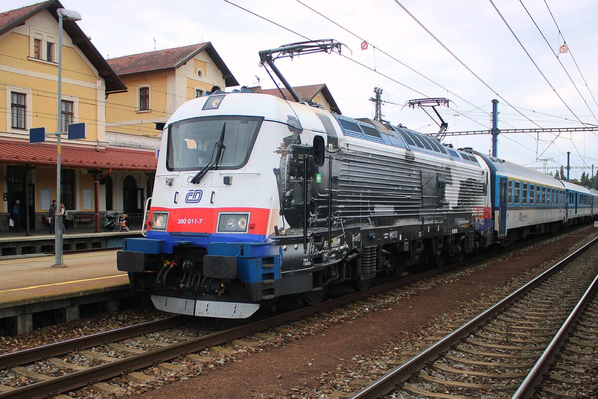 Am grauen Nachmittag von 27 September 2025 treft CD 380 011 mit ein Rychlyk nach Ceske Budejovice in Benesov u Prahy ein.