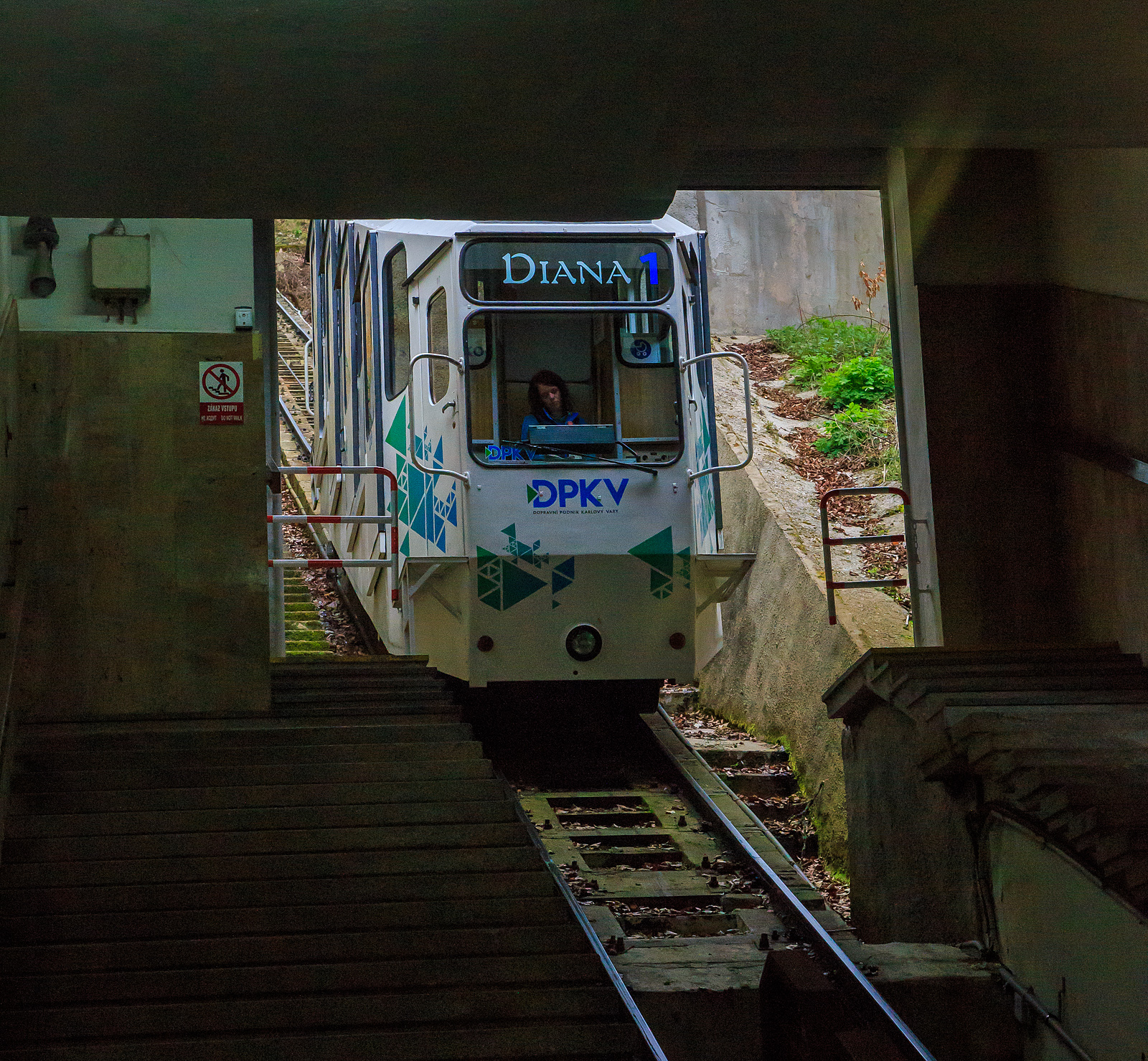 Die Talstation Stará louka (Alte Wiese) der Standseilbahn Diana (tschechisch Lanová dráha Diana) in Karlsbad (Karlovy Vary) am 18.04.2023. Sie befindet sich gleich neben dem Grandhotel Pupp in der Gasse Mariánská.