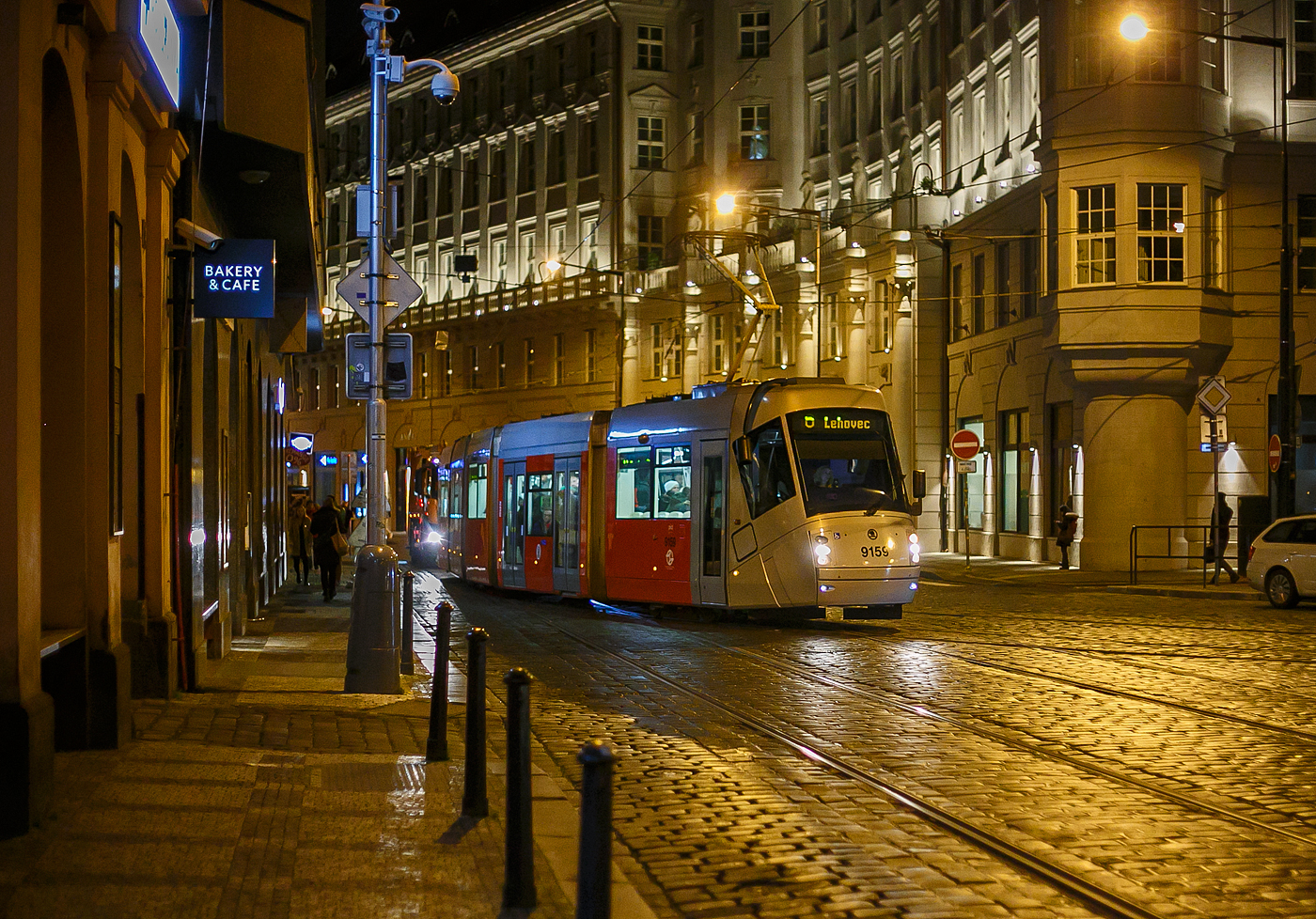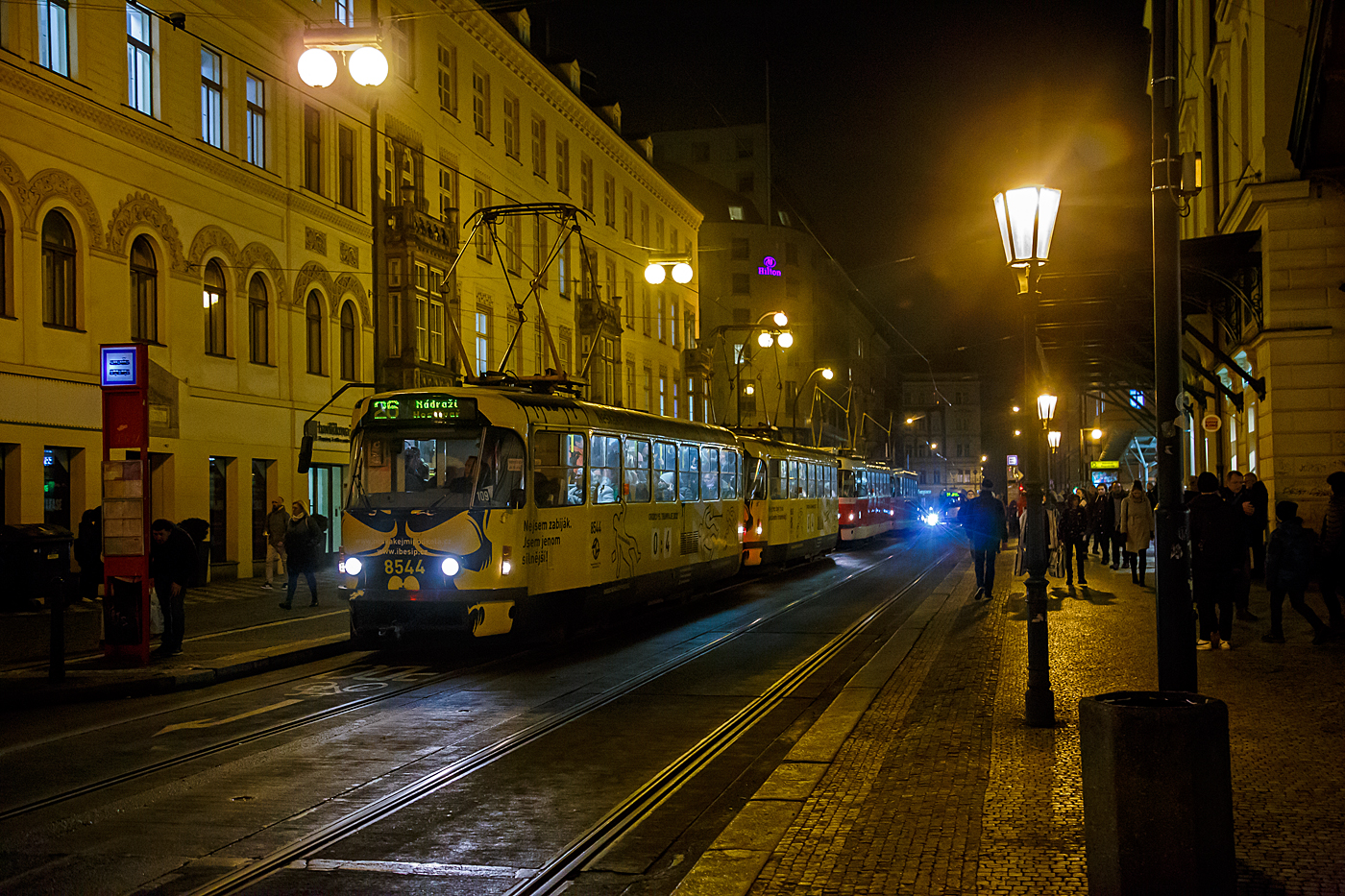 Triebwagen 5573, das T3 Coupé, der Verkehrsgesellschaft der Hauptstadt Prag (DPP - Dopravní podnik hlavního města Prahy a.s.) fährt am Abend des 22.11.2022 über die Havlíčkova beim Bahnhof Praha Masarykovo nádraží vorbei.