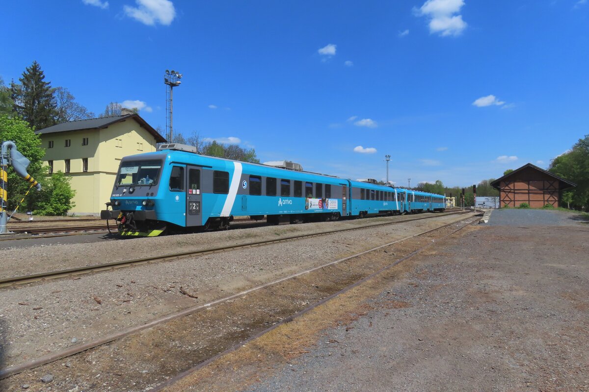 Auch modernere Triebzüge treffen in Luzna u Rakovnika ein, wie Arriva Vlaky 845 308 am 10..Mai 2024 unter Beweis stellt.