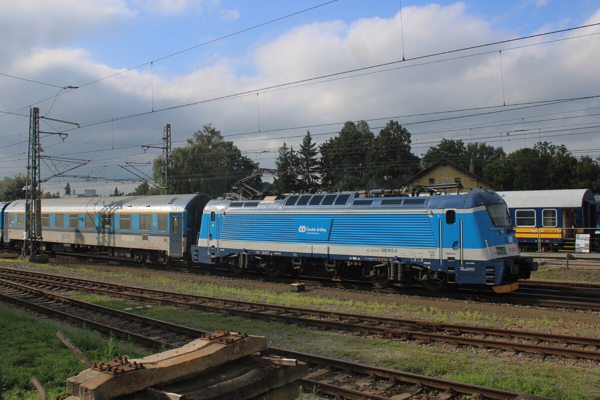 E-Lok 380 003-4 fährt mit ihrem Zug in den Bahnhof von Bratislava ein. 05.06.2023