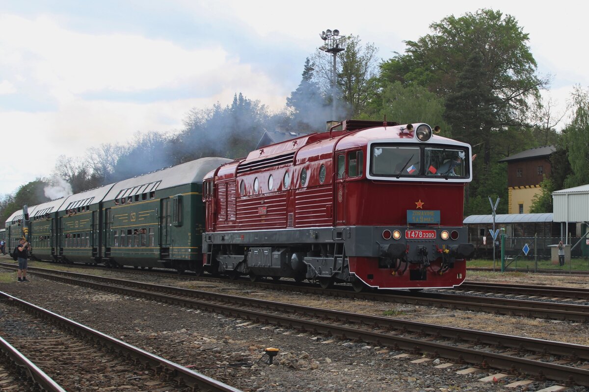 Am  11 Mai 2024 verlasst ein Sonderzug nach Ptraha hl.n. mit T478 3300 am der Spitze Luzna u Rakovnika.