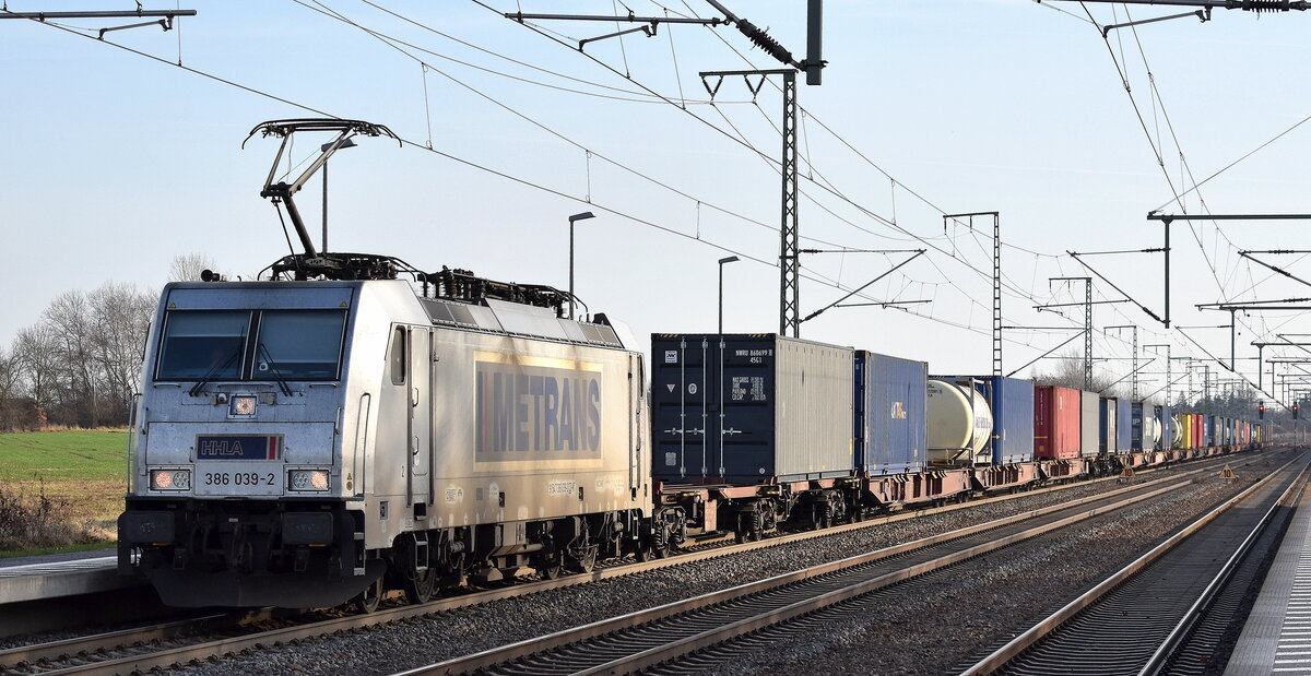 METRANS a.s., Praha [CZ] mit ihrer "383 415-7" [NVR-Nummer: 91 54 7383 415-7 CZ-MT] und einem Containerzug am 23.04.25 Höhe Bahnhof Saarmund.