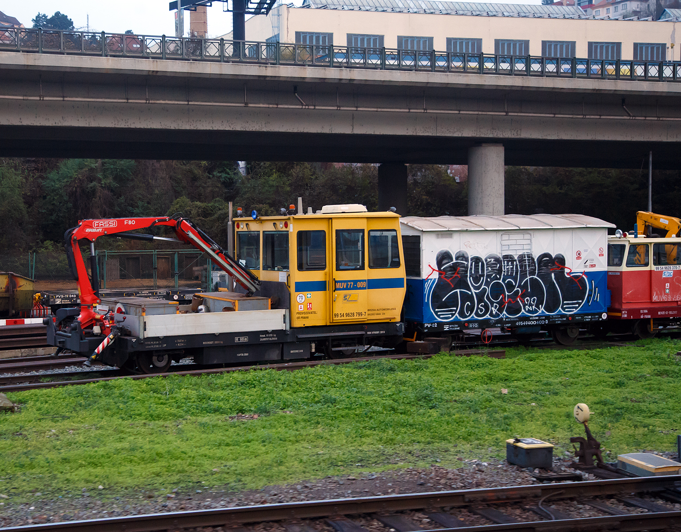 Der Kranwagen ŽDJ 5/3.1 (Kranaufbau AD-10) aufgesetzt auf den Sps Wagen 99 54 9703 006-5 CZ-SZCZ, der Správa železnic (SŽCZ), abgestellt am 23.11.2022 beim Hauptbahnhof Prag (Praha hlavní nádraží).