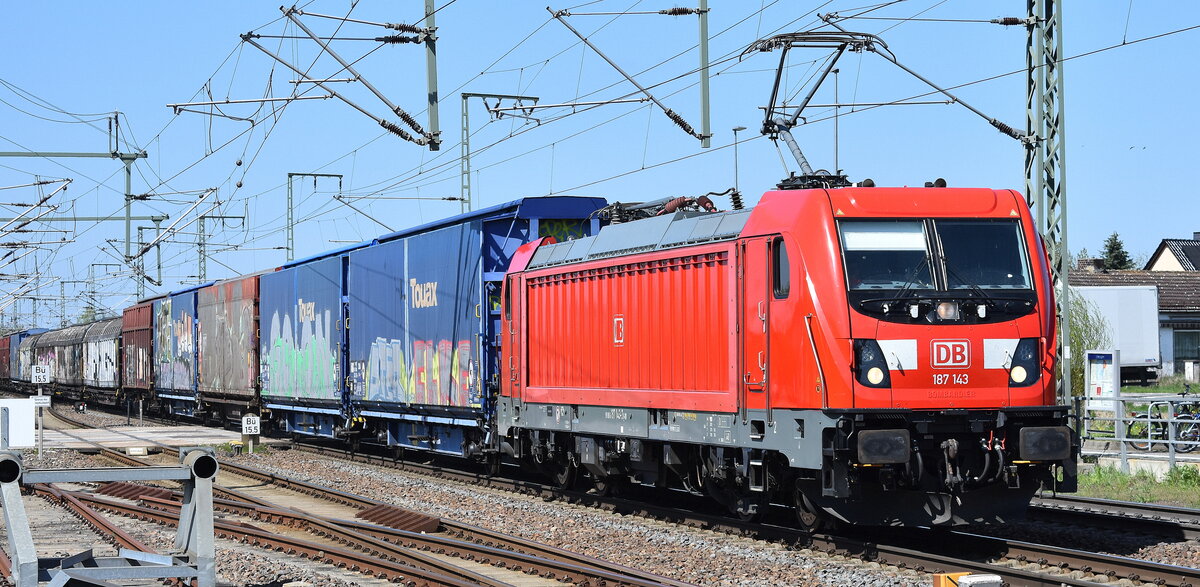 DB Cargo AG, Mainz [D] mit ihrer "187 143" [NVR-Nummer: 91 80 6187 143-3 D-DB] und ein gemischter Güterzug am 21.04.26 Höhe Bahnhof Rodleben. Lothar Stöckmann