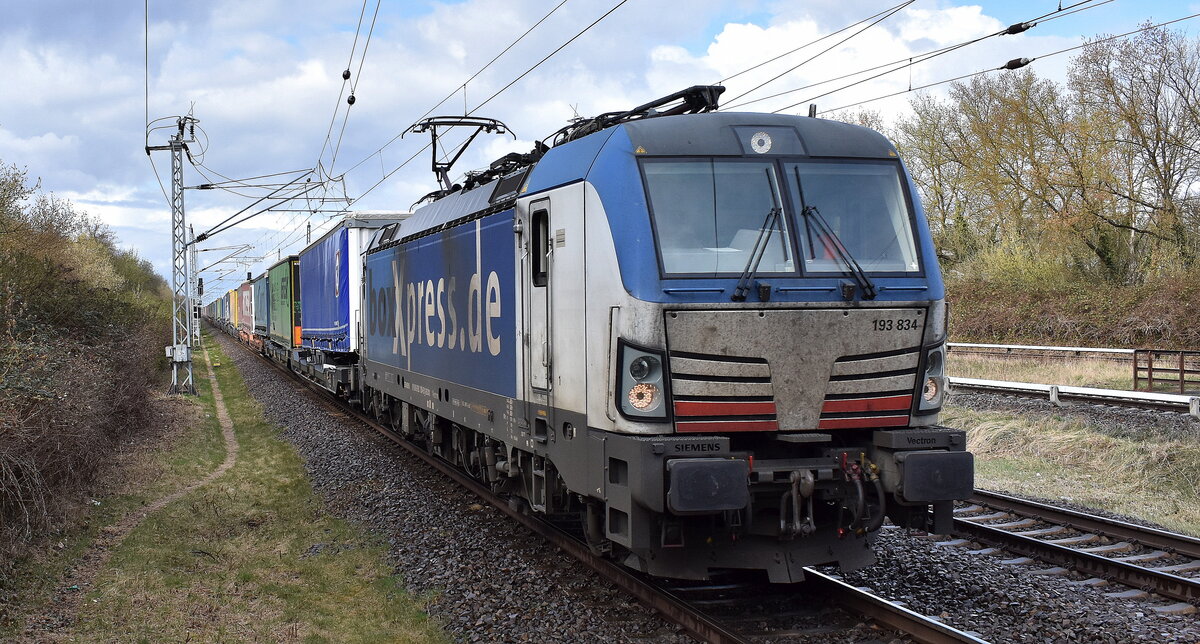 TX Logistik AG, Troisdorf [D] mit der von der boxXpress.de GmbH angemieteten Vectron "193 834" [NVR-Nummer: 91 80 6193 834-9 D-BOXX] und KLV-Zug aus Rostock Seehafen am 26.03.26 Höhe Bahnhof Berlin Hohenschönhausen. Lothar Stöckmann